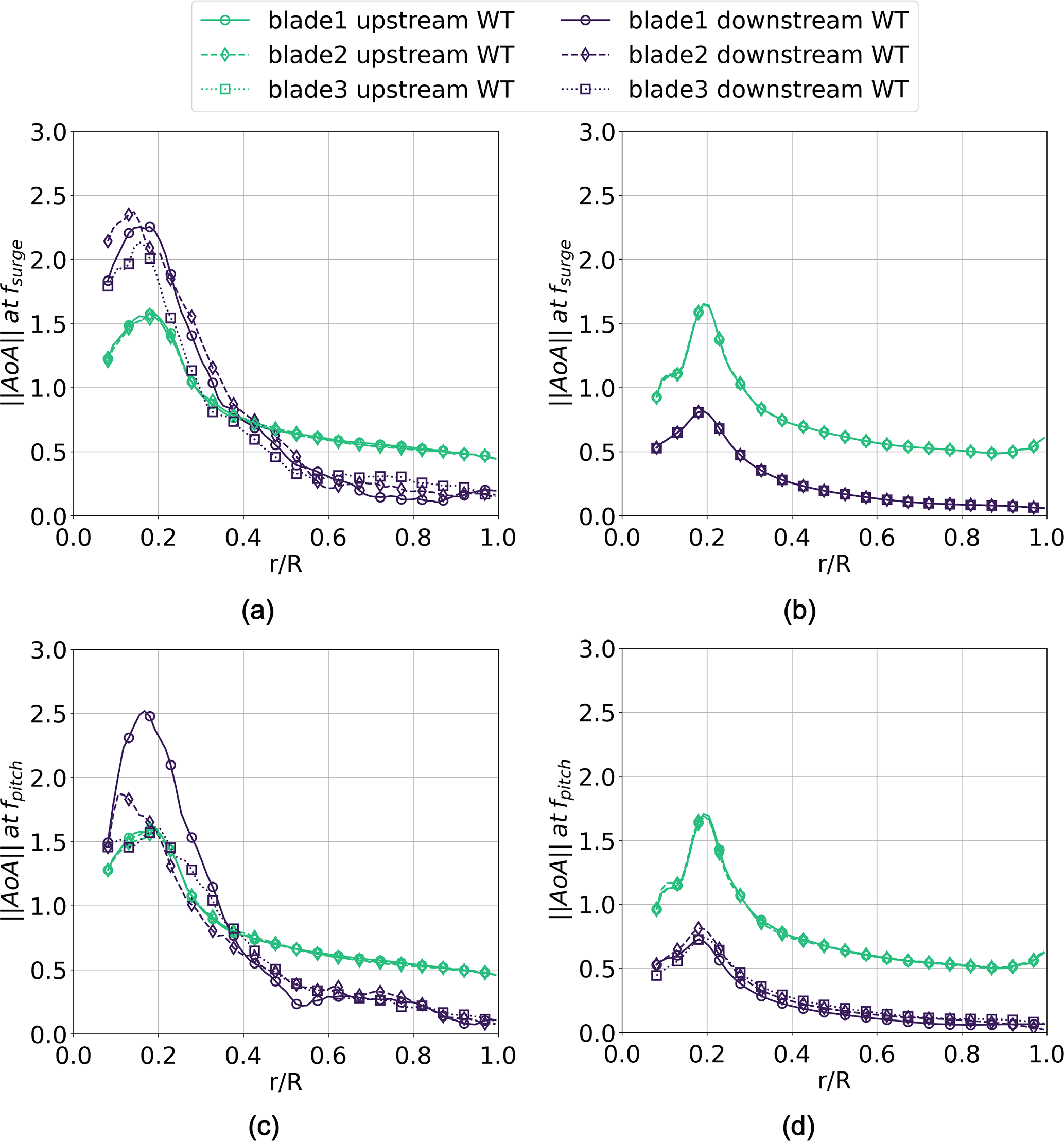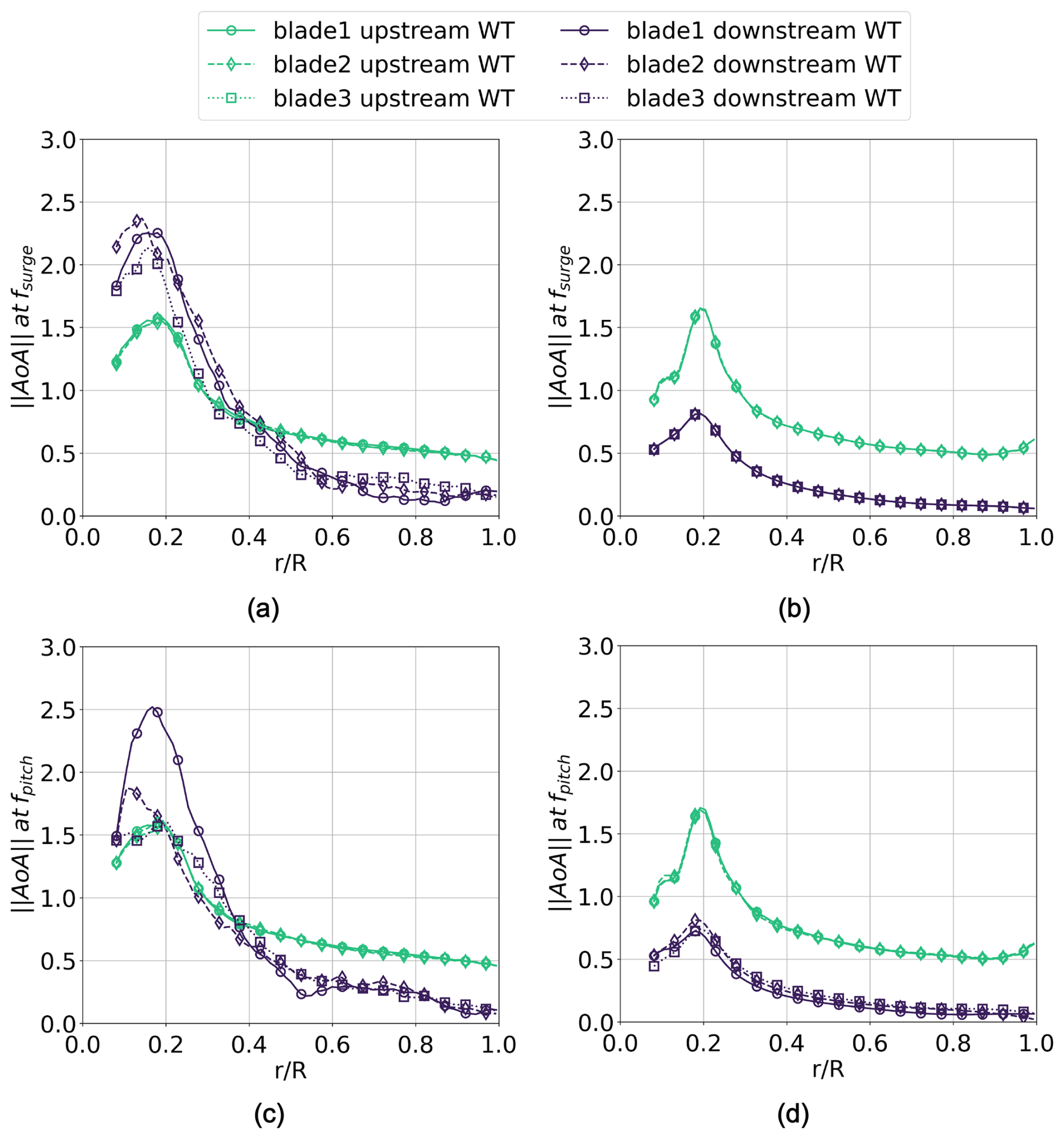 To further investigate the local effects of platform motion on turbine loads, an analysis of spanwise quantities is presented. In particular, Fig. 24 shows the radial distribution of the amplitude of the phase-averaged angle of attack at the frequency of the upstream turbine platform motion. To provide a comprehensive overview, the trend is reported for both the upstream and the downstream turbines, under surge and pitch motions, using both turbulent LES and URANS simulations. To identify potential asymmetries induced by pitch motion or inherent in the wake, the results are presented for all three blades. For the upstream turbine, this representation highlights the AoA variations directly caused by the platform motion itself, and the comparison between blades helps detect any asymmetries. For the downstream turbine, the analysis reveals which rotor regions experience the greatest AoA fluctuations due to wake velocity oscillations, and the blade-to-blade comparison helps assess any non-uniformities in the wake impacting the downstream rotor.