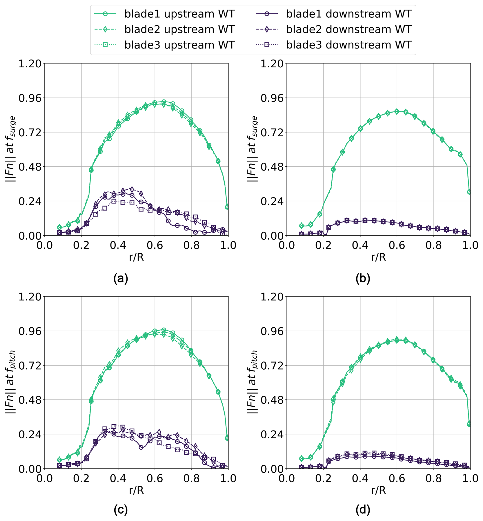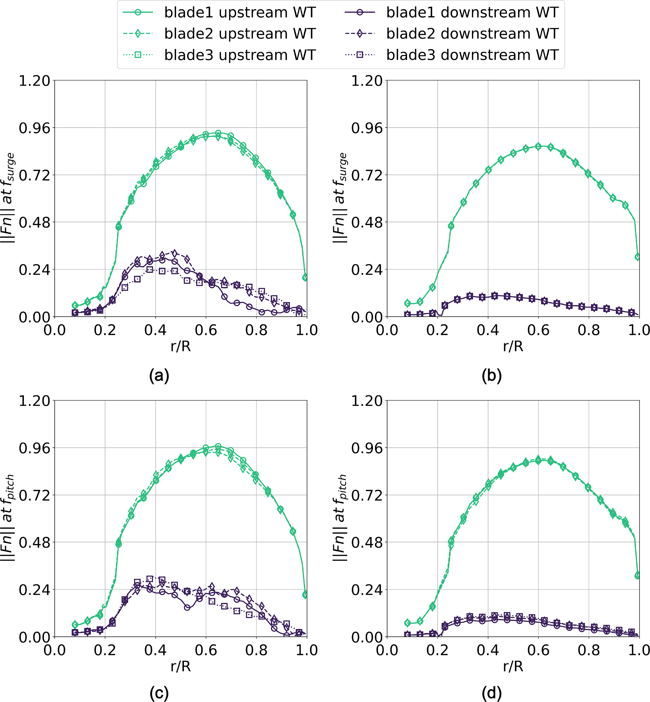Figure 25Spanwise normal-force amplitude at the motion frequency. (a) Surge case – LES turbulent. (b) Surge case – URANS. (c) Pitch case – LES turbulent. (d) Pitch case – URANS.