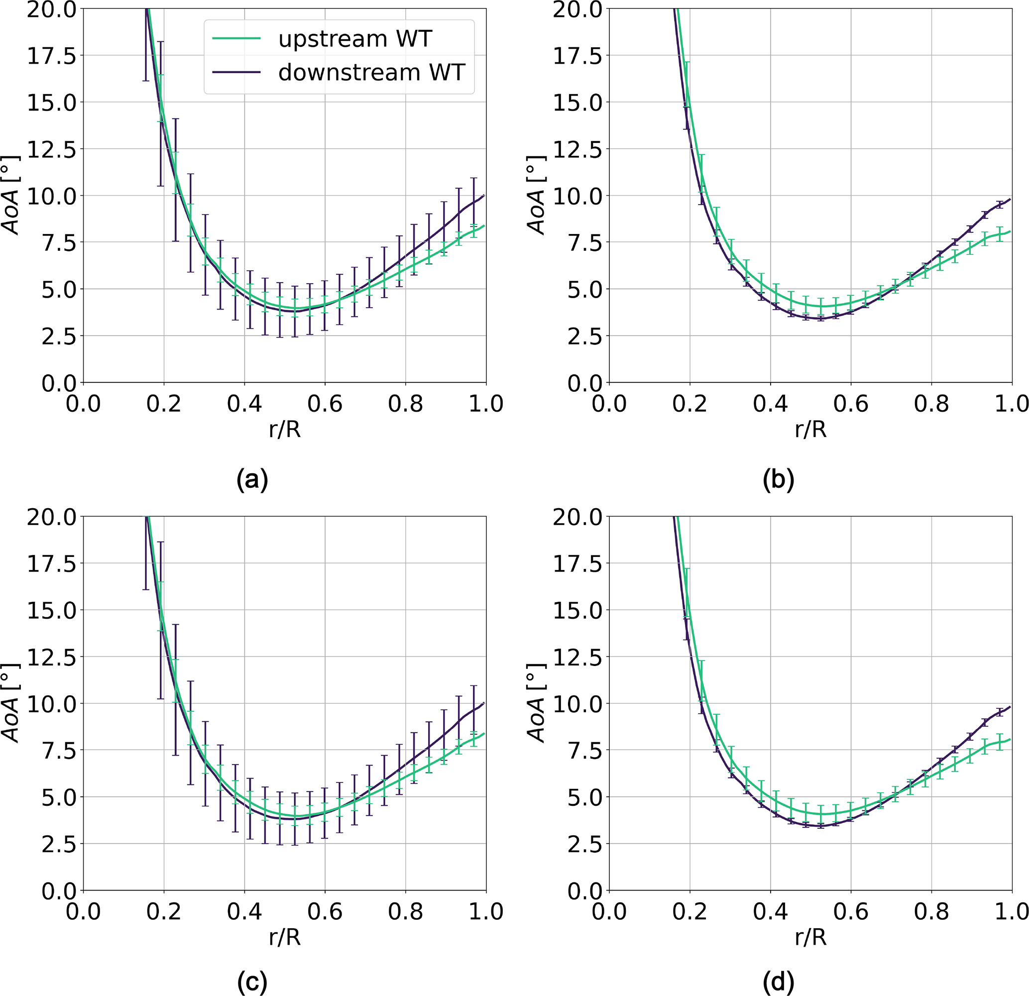 For the downstream turbine, larger AoA amplitudes are again observed in the root region, attributed to the same peripheral speed effect, in both LES and URANS calculations. However, in the LES results, these amplitudes are further amplified from the root up to about 50 % span due to stronger wake oscillations, as shown in Fig. 13. The blade-to-blade comparison in the LES cases indicates a greater inflow non-uniformity in the root region. In the URANS simulations, the comparison reveals a slightly more visible asymmetry in the pitch case.