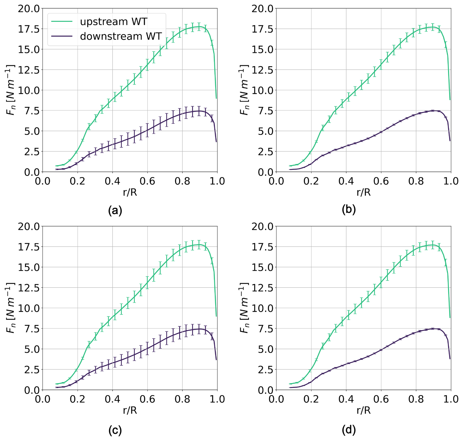 A similar analysis is provided in Fig. 27 for the normal force to assess the variability of aerodynamic loads. Consistent with previous observations, where variability is dominated by platform motion (upstream turbine), URANS captures similar variations to LES. Where turbulence dominates (downstream turbine), URANS continues to exhibit only the deterministic effect of the upstream platform motion. Therefore, this analysis has enabled a comprehensive characterization of the loads acting on both turbines, in both global and local terms. URANS simulations clearly demonstrate a systematic underestimation of load amplitudes on the downstream turbine due to wake-induced oscillations, as well as a significant under-prediction of the overall load variability. Such an underestimation could severely compromise the accuracy of structural assessments, potentially leading to reduced reliability in predicting turbines' long-term performance and fatigue life.