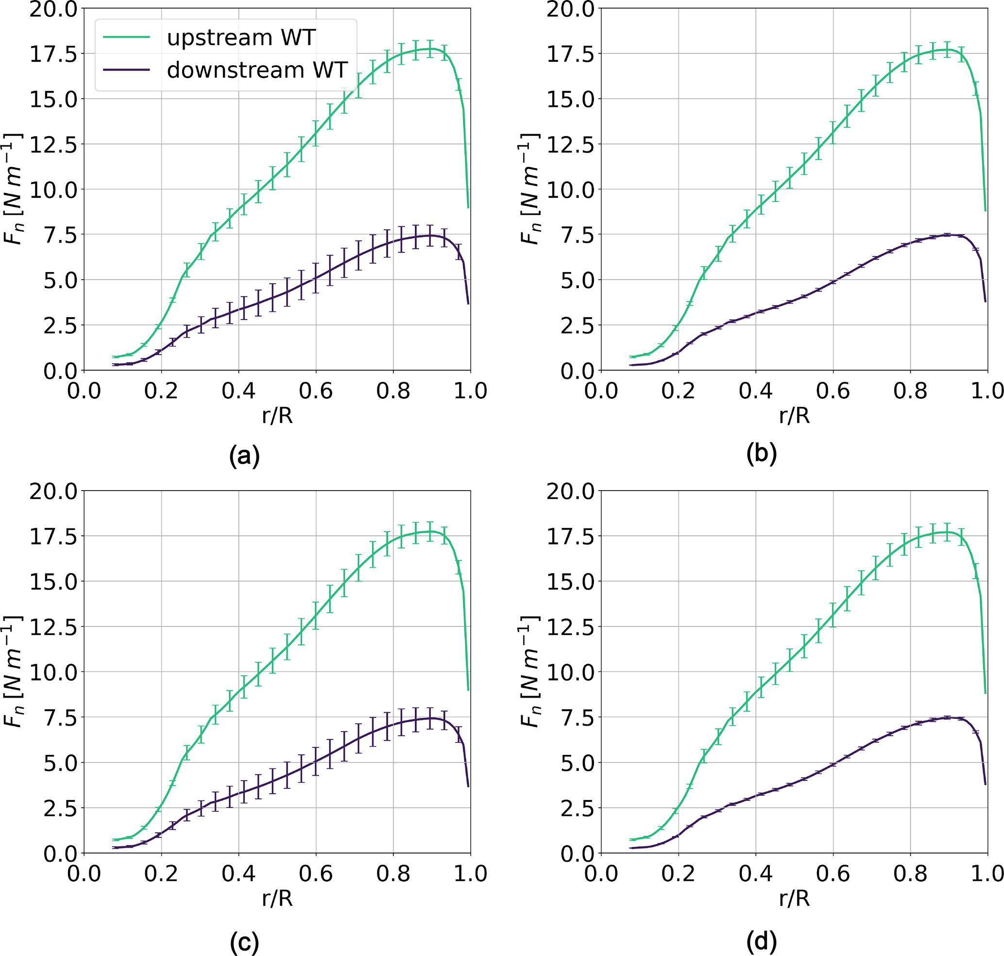 Figure 27Spanwise mean and standard deviation of the normal force. (a) Surge case – LES turbulent. (b) Surge case – URANS. (c) Pitch case – LES turbulent. (d) Pitch case – URANS.