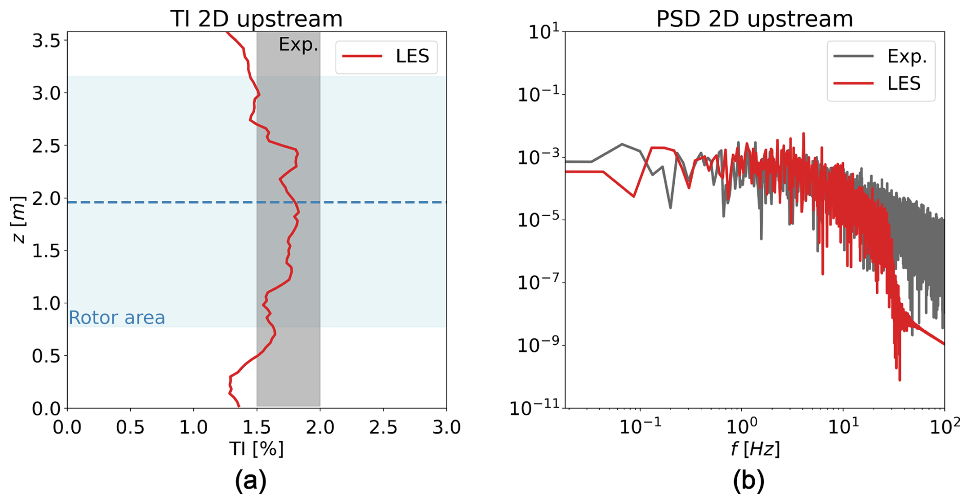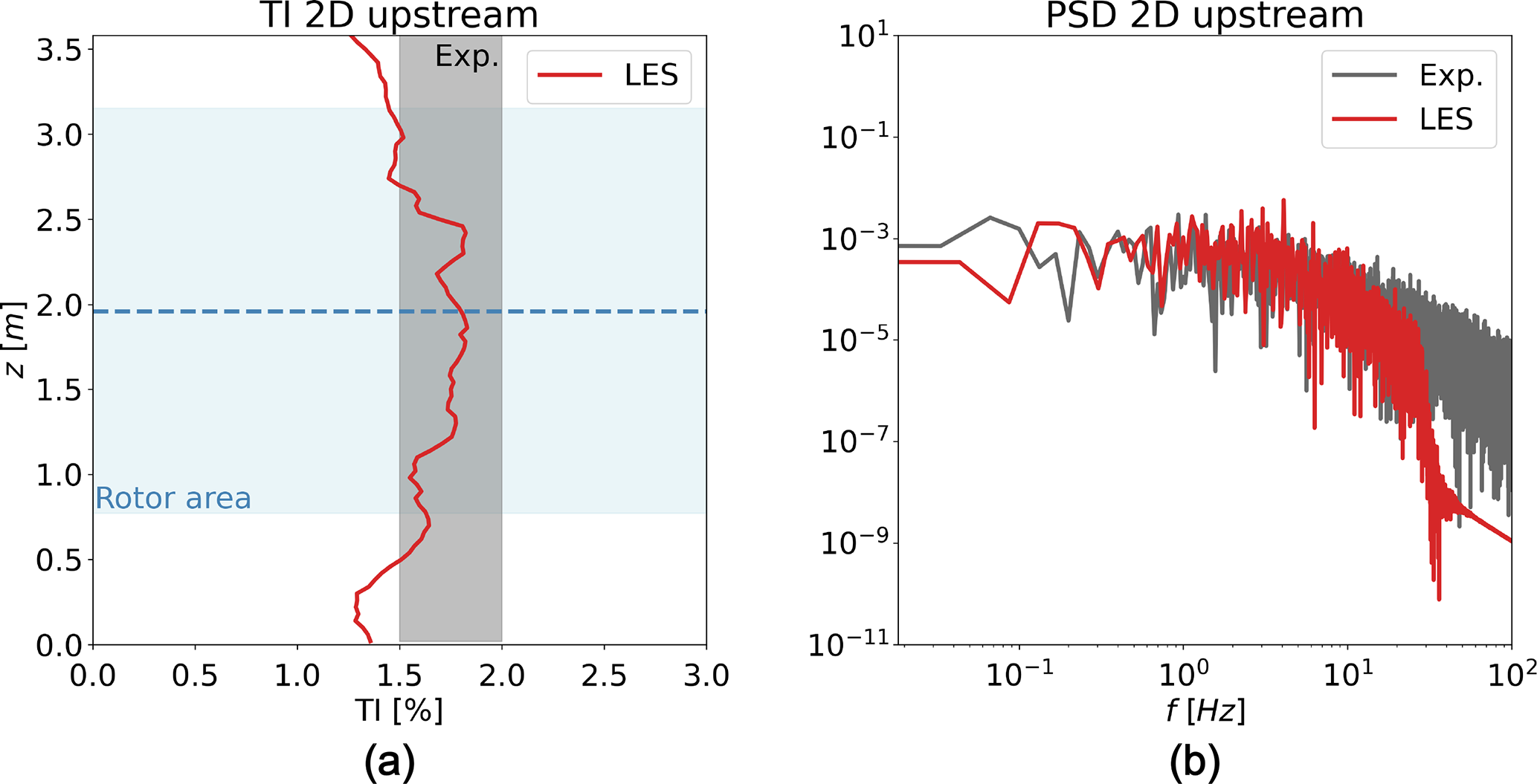 Figure A1a presents the vertical profile of turbulence intensity for the streamwise velocity component, obtained from the numerical simulation at a distance of 2 D upstream of the turbine. The numerical turbulence intensity distribution lies within the experimental range, highlighted in grey, across the entire rotor area. Additionally, Fig. A1b compares the power spectral density of the streamwise velocity component from both numerical and experimental data in a point at the hub height and 2 D upstream of the turbine location. The two spectra exhibit good agreement up to the point where numerical LES filtering becomes noticeable.