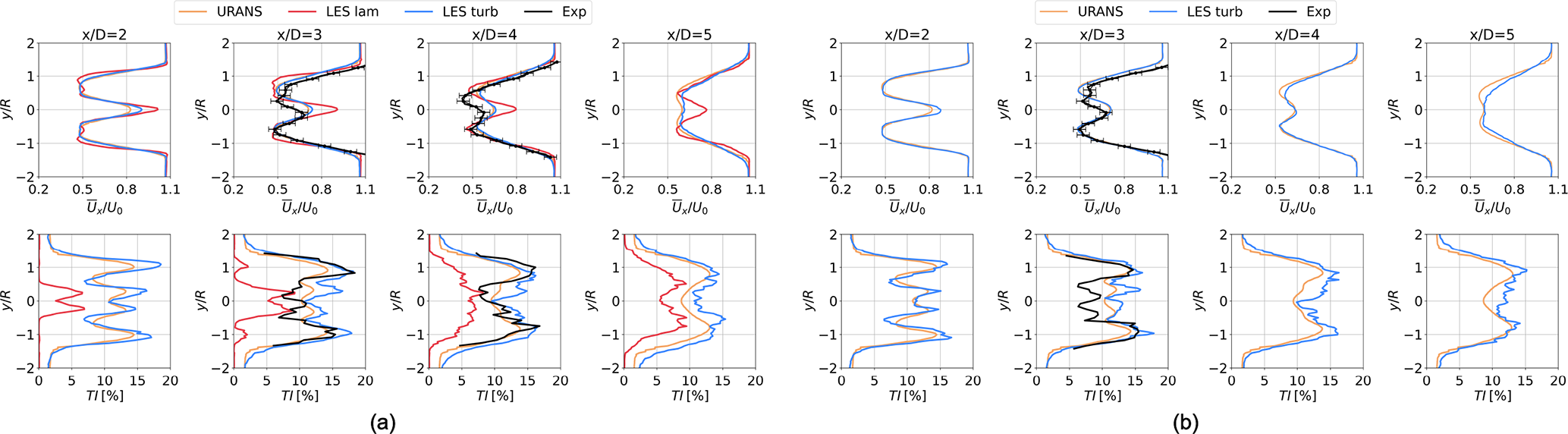 To further support these observations, Fig. 9a shows the mean axial velocity for laminar and turbulent LES cases, computed using Eq. (5) over each horizontal line, as a measure of wake recovery.