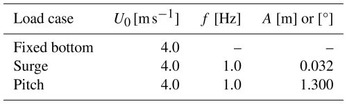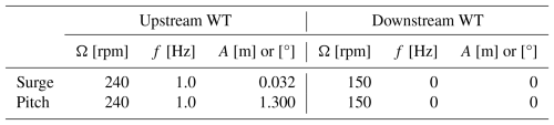 where represent the amplitudes and the frequencies of the surge and pitch motions, respectively. The phase shift ϕ accounts for the motion lag and, in the cases considered, is set to zero to initiate the platform motion in the leeward direction. The instantaneous velocity of the platform due to these prescribed motions is obtained by differentiating the displacement expressions. A key aspect of floating turbine dynamics is the apparent wind, which refers to the relative wind speed experienced by the rotor due to platform movement. The resulting variations in apparent wind speed at hub height reach a maximum excursion of in both the surge and the pitch cases, namely ±5 % of the mean wind speed. The platform displacement and the corresponding apparent wind velocity are shown in Fig. 1 as a function of one platform motion. Details of the amplitudes and frequencies used for the imposed platform motions are summarized in Table 2.