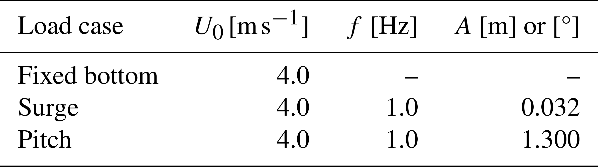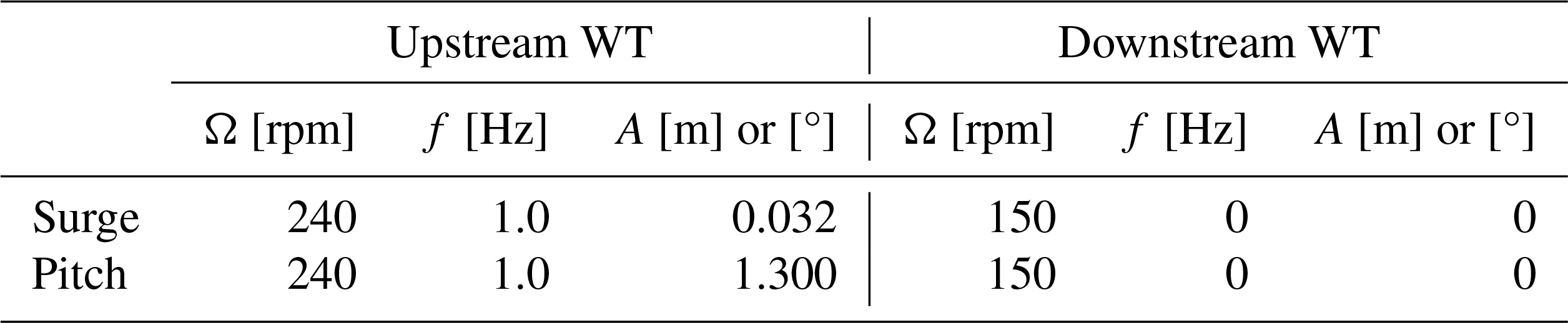 This study presents a series of simulations in different operational scenarios, including both fixed-bottom and floating wind turbine configurations, to validate the numerical results. Three primary cases are considered: a fixed-bottom reference, a platform undergoing surge motion, and a platform undergoing pitch motion. All experiments and simulations were carried out with a constant rotor angular speed of Ω=240 rpm, representative of rated operating conditions, corresponding to a tip-speed ratio , with a wind speed U0=4 m s−1.