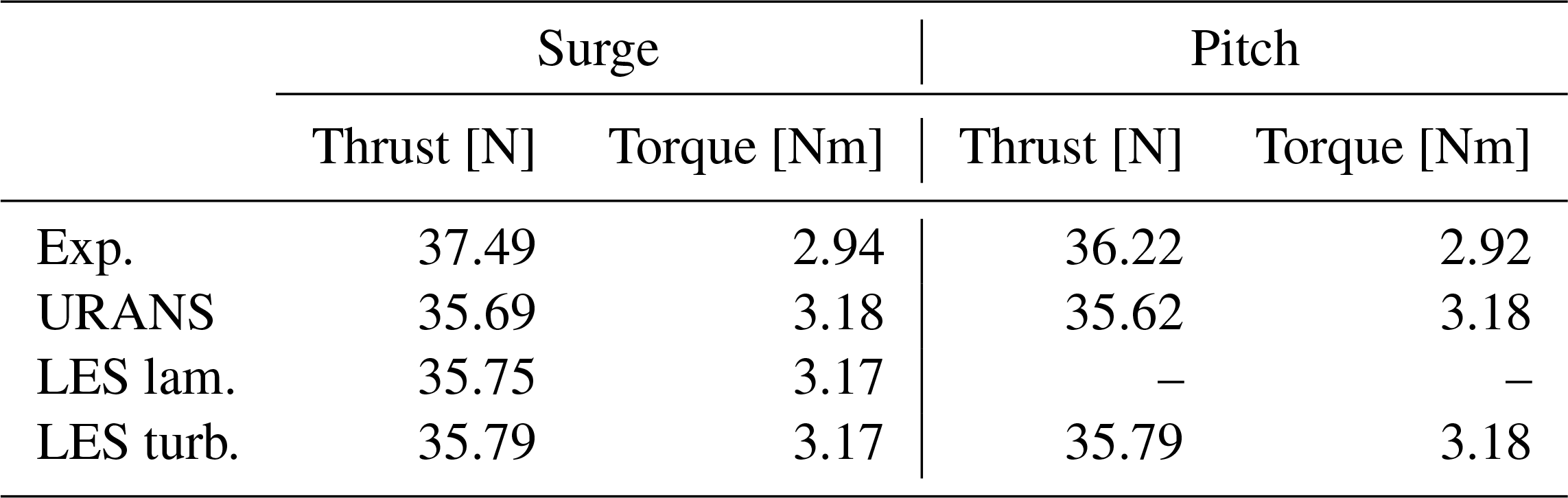 To complete the analysis, Table 4 reports the mean thrust and torque values for surge and pitch.