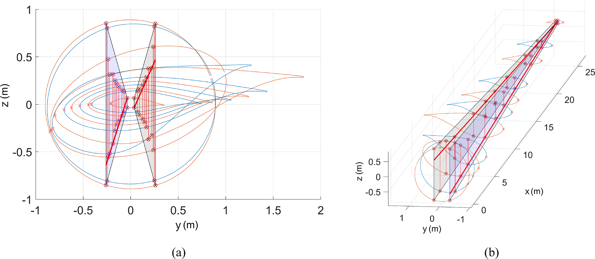 Figure 2Web straightening algorithm output for the 1 MW initial design. The algorithm adjusts the connection points of the webs by removing twist and checking the proximity of the web against a straight projected plane. In this case, the webs are constrained onto the planes passing through the webs at the tip and webs of the section with the widest spar cap. Panel (a) shows a view of the resulting blade from the root, while panel (b) shows a 3D view with the superimposed guide planes.
