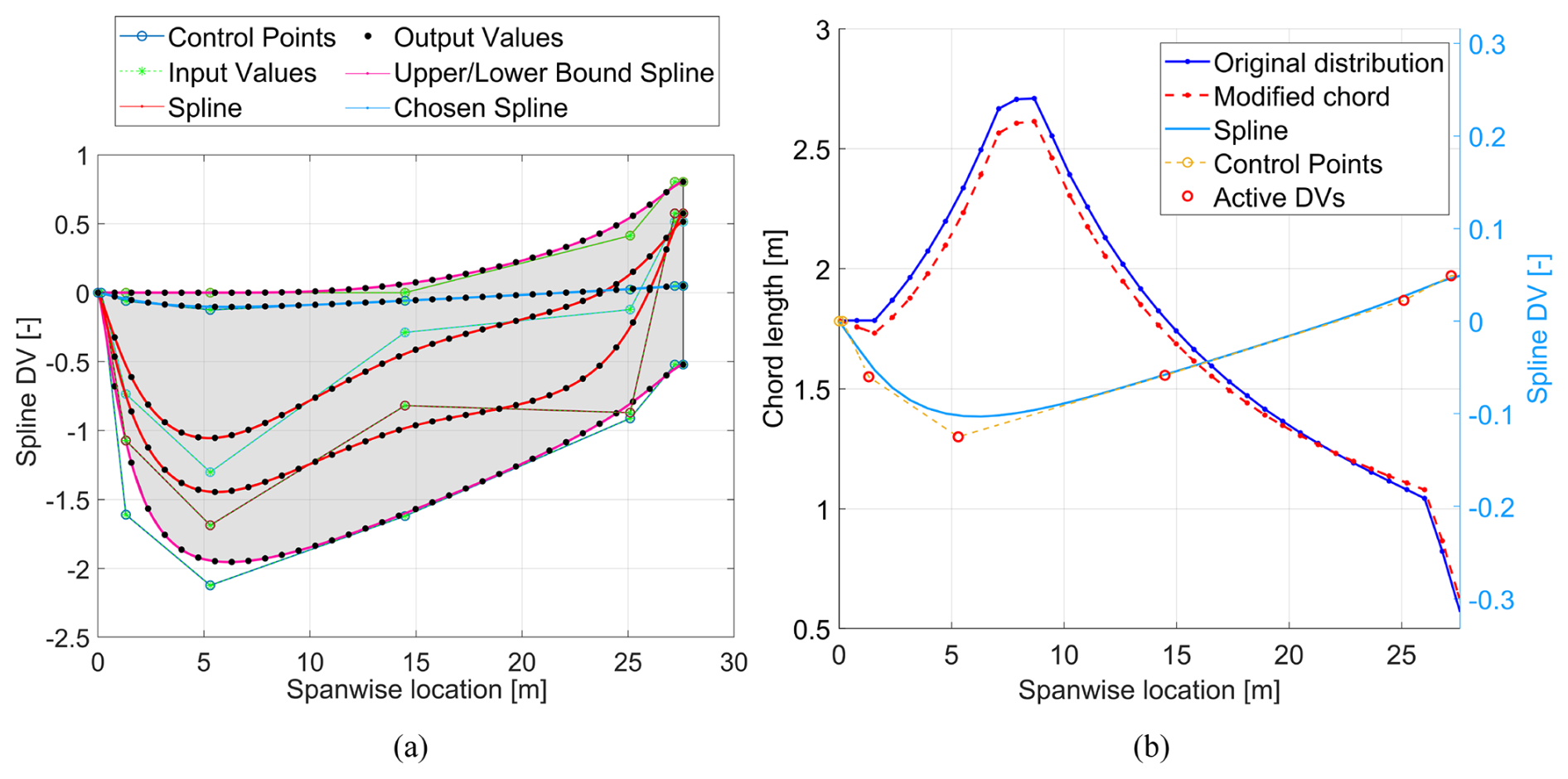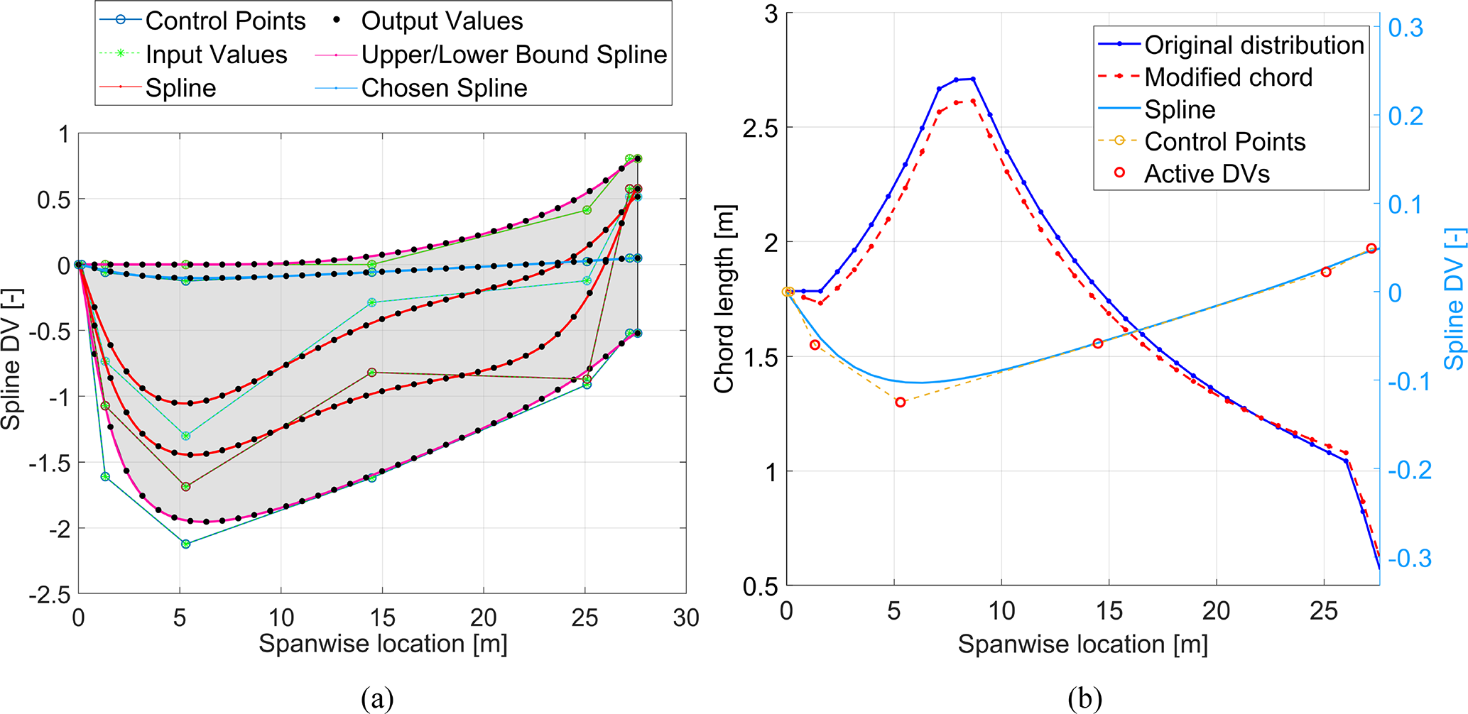 Figure 3Illustration of “baseline plus spline” design variable adjustment process as applied to the chord distribution of a 1 MW blade design. Panel (a) displays the range of spline curves that can be generated based on the design variable bounds (shaded in grey), and panel (b) shows the baseline and modified chord distributions following the implementation of the blue spline curve highlighted in panel (a).