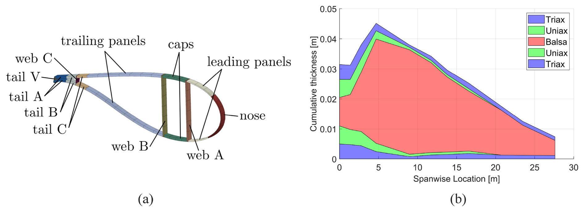 Figure 4Depiction of material thickness DV regionalisation (a), along with an example of the leading panel thicknesses from the 1 MW design (b). The thickness of each layer in each region is set as an active design variable. (a) is reproduced with permission from (Bak et al., 2013).