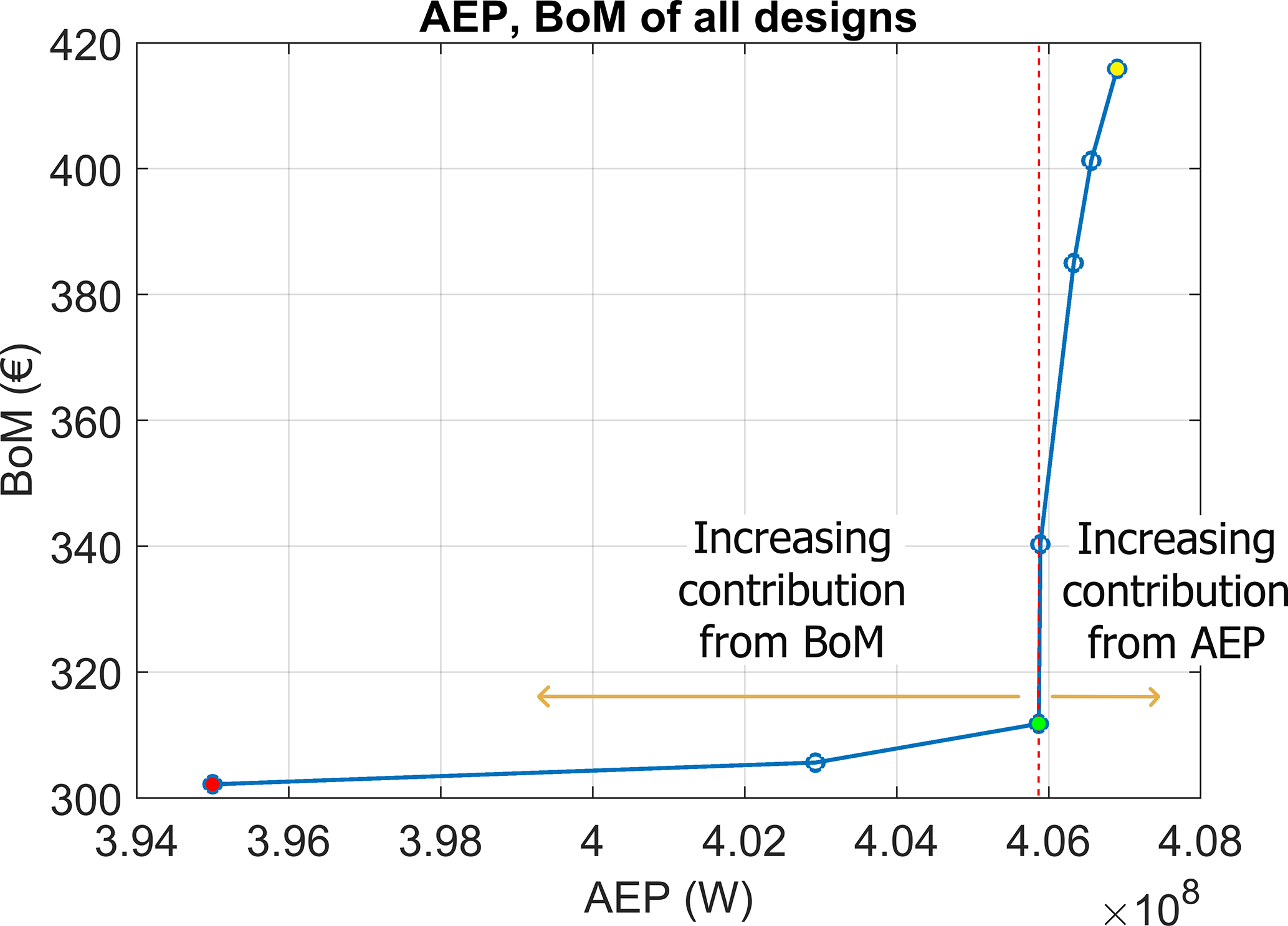 Figure 5AEP and BoM performance of resulting designs from optimisation objectives with differing weightings shown in Table 3. Three points/objectives are highlighted. The red point has a relative AEP contribution of 0.2, α=2.85 and β=12. The yellow point has a relative AEP contribution of 100, α=12 and β=0.1. The green point has a relative AEP contribution of 5, α=12 and β=2, and corresponds to the objective chosen for this study.