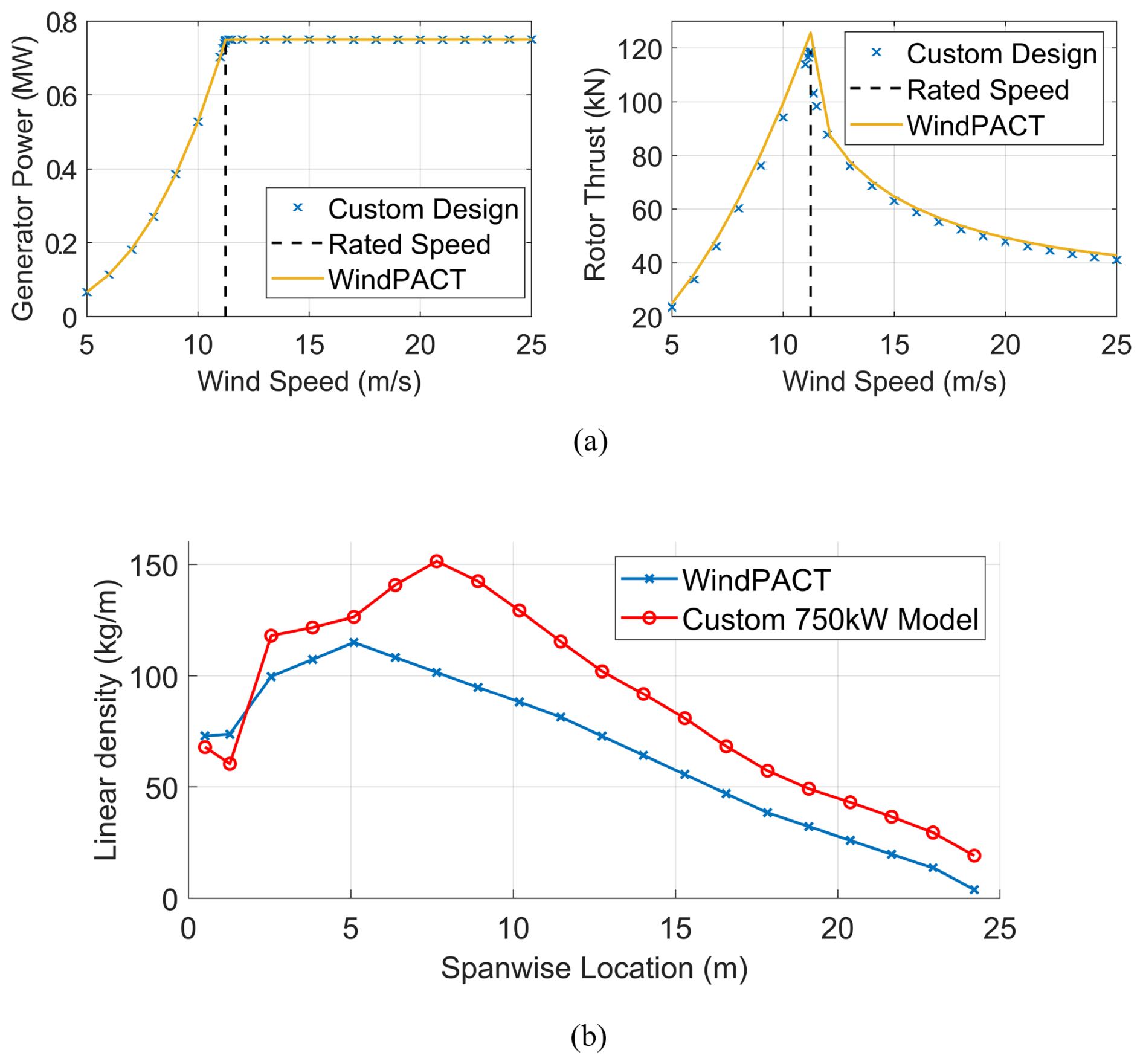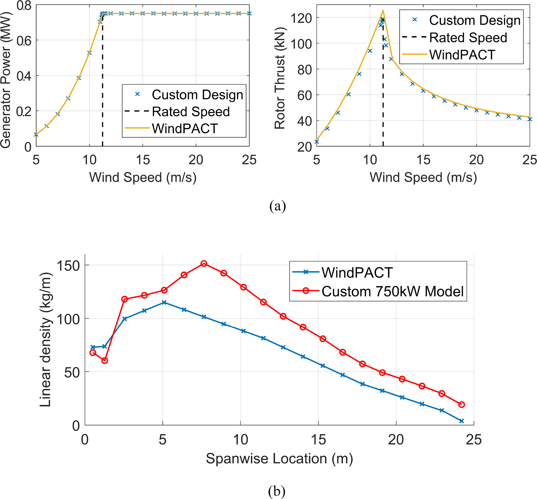 In this section, the performance of the custom reference rotors as predicted by ATOM is presented. As the rotor models are made available in an open-source format through NREL's OpenFAST software, the performance predictions from each program are compared against one another for validation. To benchmark the design process carried out with the ATOM software, one of the custom optimised blades is designed for a rated power of 750 kW to coincide with the smallest publicly available reference wind turbine, the WindPACT 750 kW turbine (Rinker and Dykes, 2018). The resulting blade design achieves similar aerodynamic properties although the custom blade mass was heavier (2413.99 kg compared to WindPACT's 1941 kg, including the mass of the root connection in both models). The custom model masses calculated by ATOM during the optimisation do not include the mass of the bolt insert studs in the root connection. To make the comparison against the WindPACT blade, the WindPACT root connection mass (298.49 kg) was added to the mass of the custom 750 kW blade. The WindPACT model experiences also a slightly greater spike in rotor thrust at rated speed. These discrepancies are illustrated in Fig. 6.