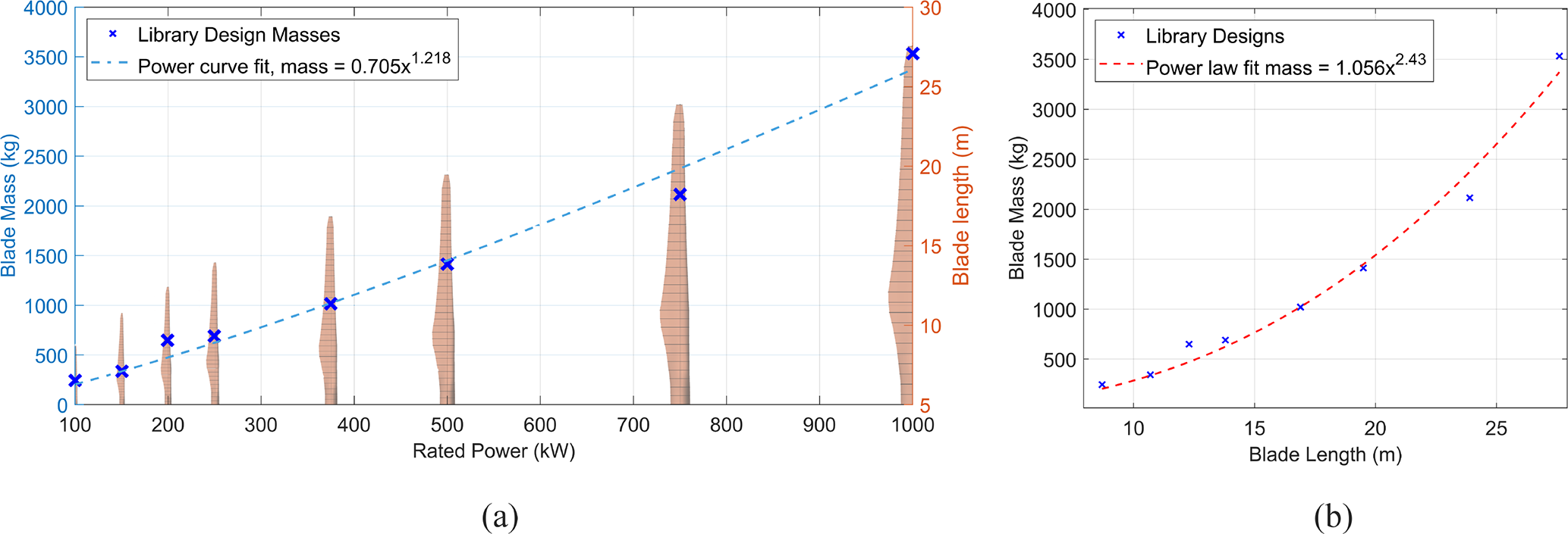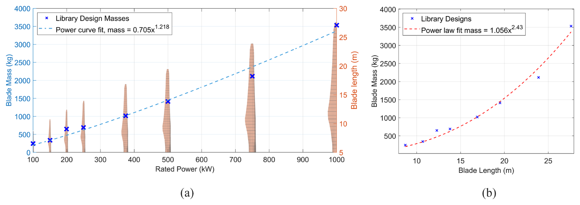 Figure 7Blade mass and length scaling across the rotor design library. Panel (a) shows the blade mass against power rating for each rotor design, with a power law fit. The overlaid blade models correspond to the blade lengths/rotor radii measured on the right-aligned y axis. Panel (b) shows the scaling of the blade masses in the rotor library against the blade length, with the power law predicting a scaling exponent of 2.43. The masses displayed are the direct outputs of the optimisation, without any post-processing.