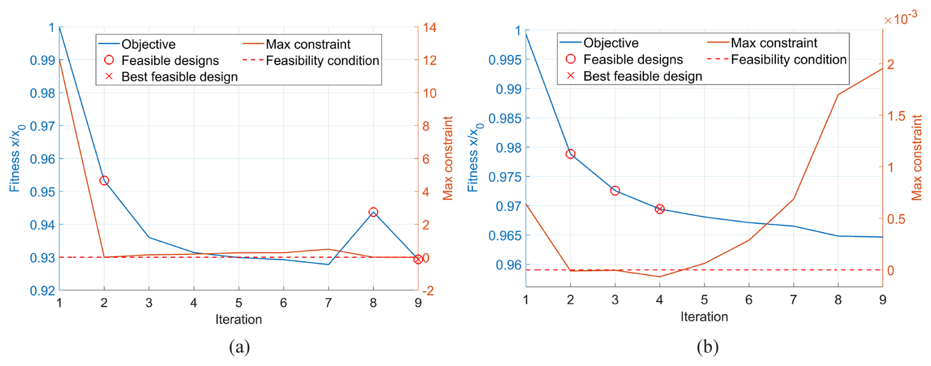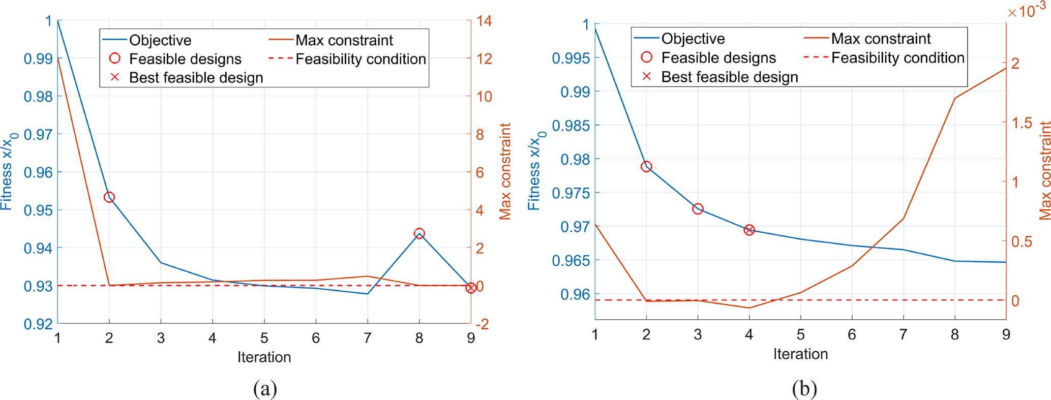 Figure 8Optimisation histories for the (a) 100 kW and (b) 1 MW blades. For a design to be feasible, the maximum constraint must be below zero – a threshold that is marked by the dotted red line. The feasible designs are marked on the blue objective curve with a red circle, and the feasible design with the lowest corresponding objective value is marked with a red cross.