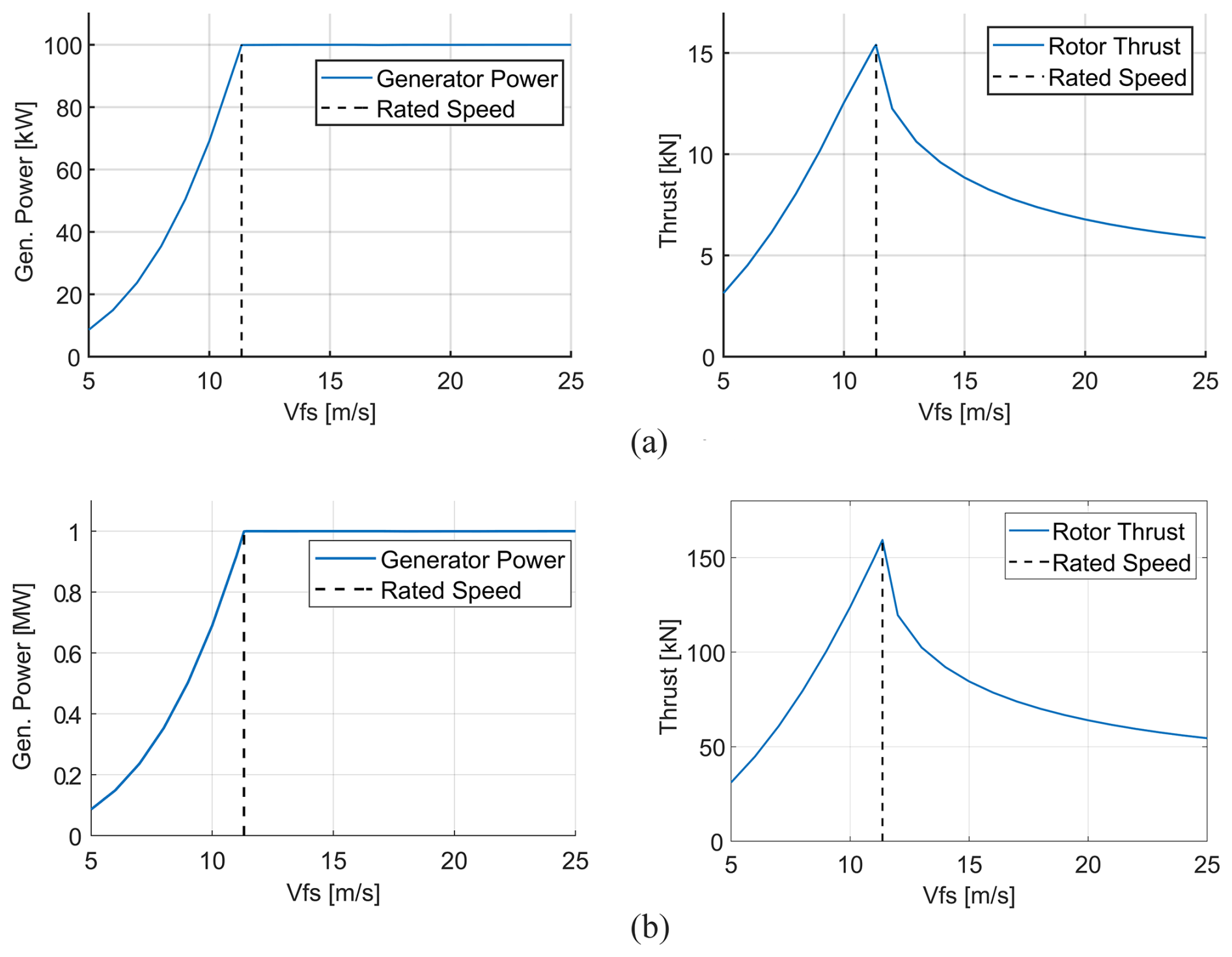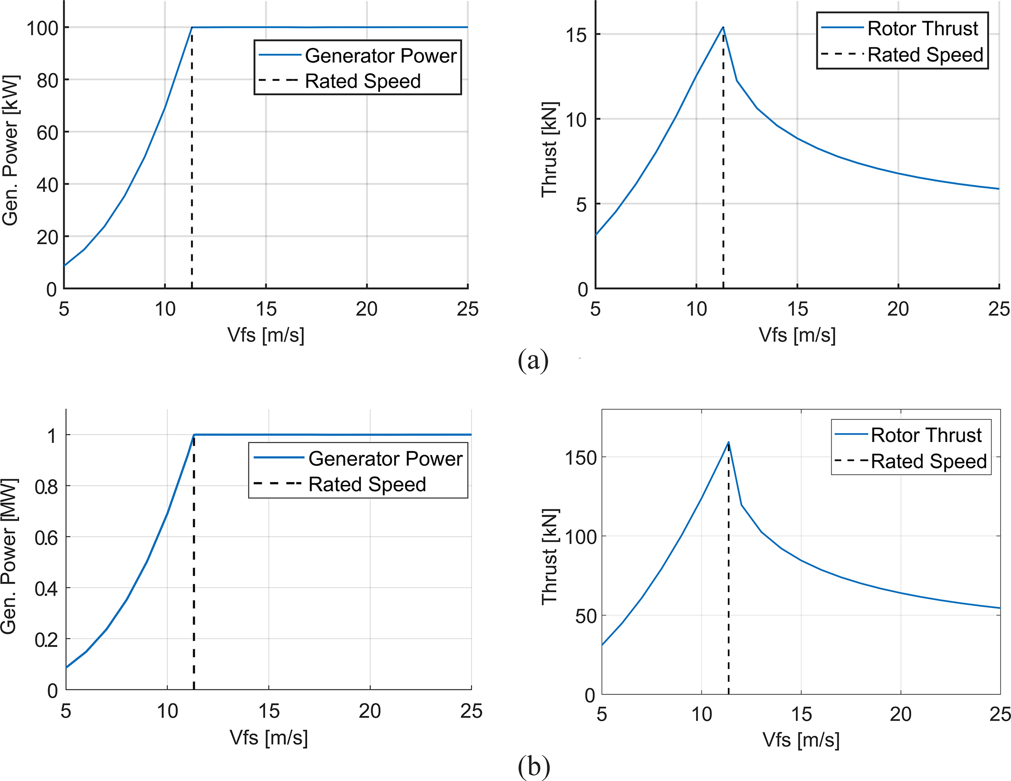 Figure 9Power and thrust curves for the (a) 100 kW and (b) 1 MW custom blade designs, as a function of freestream wind velocity (Vfs).