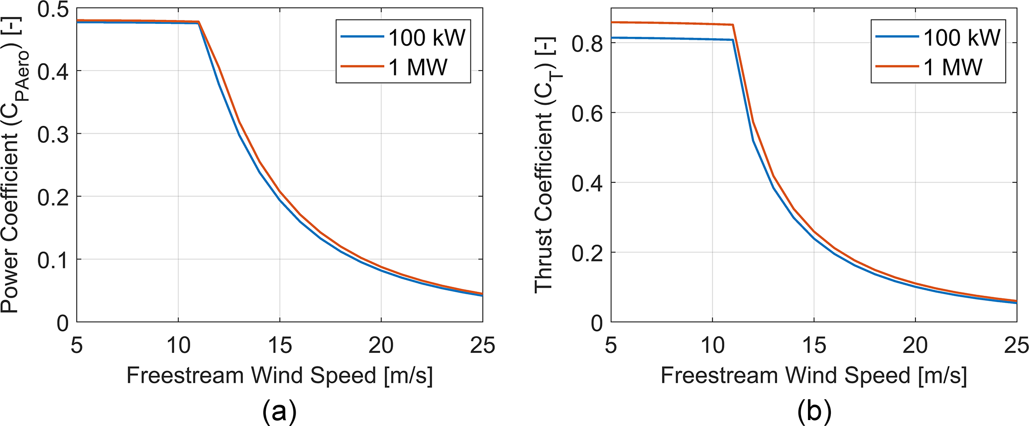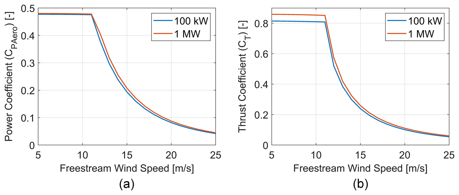 Figure 10Dimensionless (a) aerodynamic power (not including electrical or drivetrain losses) and (b) thrust coefficients of the 100 kW and 1 MW custom blade designs, as a function of freestream wind velocity.