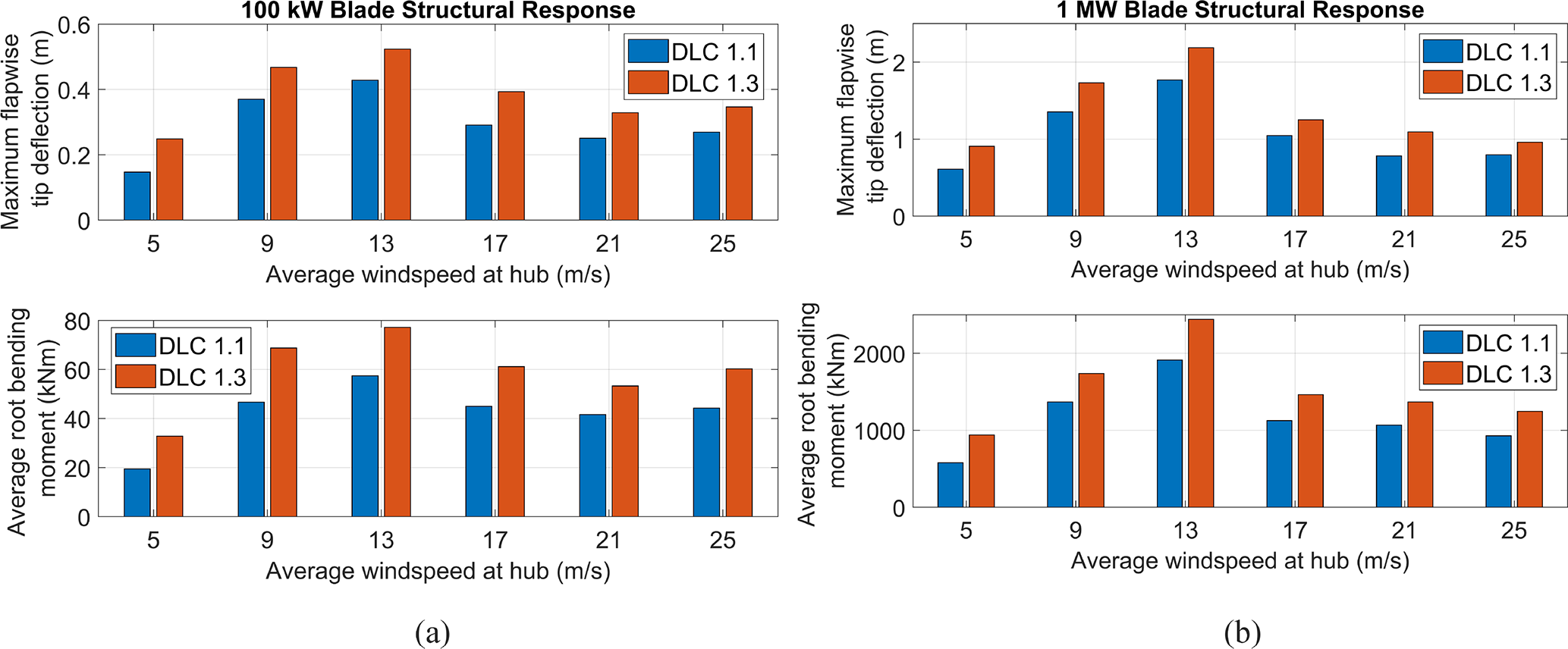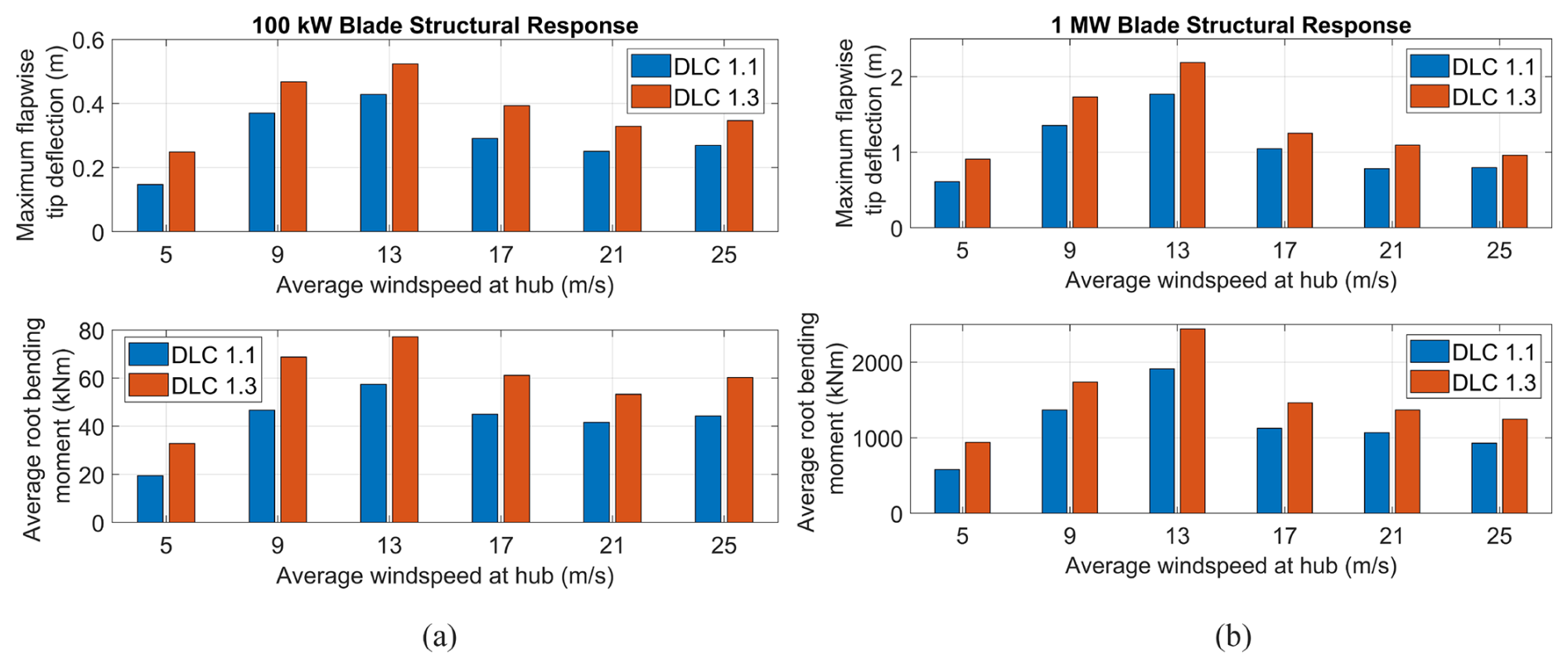 Figure 11Maximum tip deflection and average root bending moment (both in the flapwise sense) of the (a) 100 kW and (b) 1 MW custom blade designs, separated by average hub windspeed and DLC.