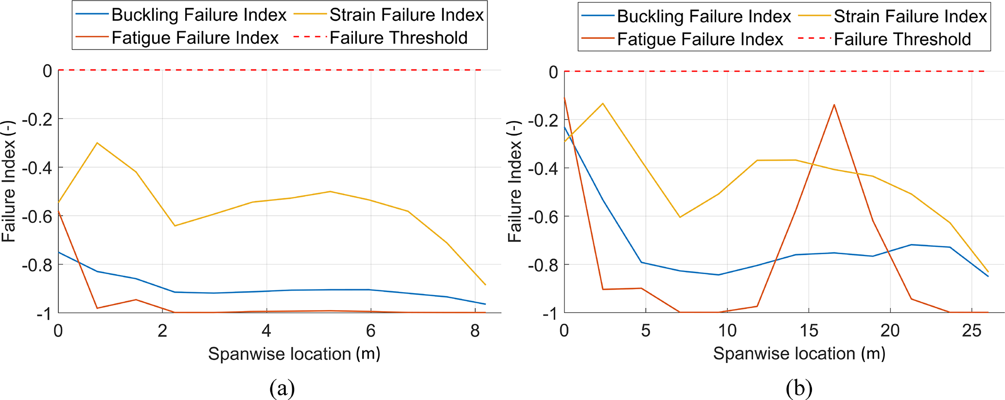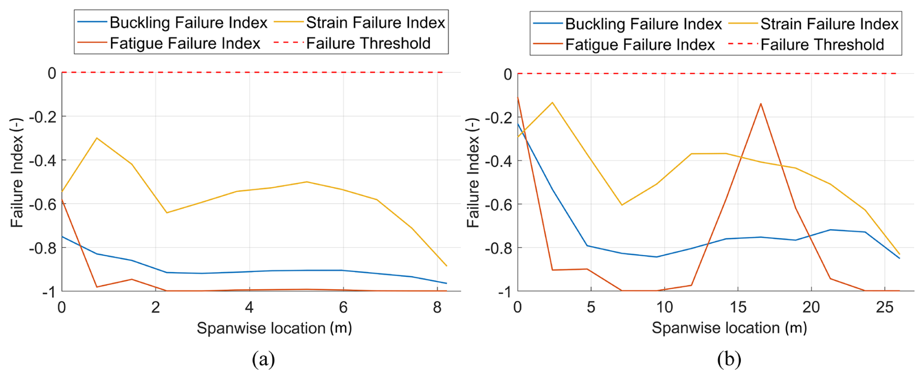 Figure 12 shows the material performance of the 100 kW and 1 MW blade designs using the sectional proximity to failure in buckling, strain and fatigue. The design appears quite conservative for the 100 kW blade, with failure indices remaining below −0.6 for fatigue. In the ATOM optimiser, the values of constraints are scaled in order to give each constraint a similar order of magnitude for simpler comparison. The fatigue constraint value is quite strongly scaled, which is why the chosen design for the 100 kW blade appears very close to failure in Fig. 8 but not in Fig. 12. However, sections of the 1 MW blade experience loads that bring the design close to its material limit, especially in fatigue. This is consistent with the optimisation history of the 1 MW blade from Fig. 8, which shows the difficulty faced by the optimiser in ensuring structural feasibility.