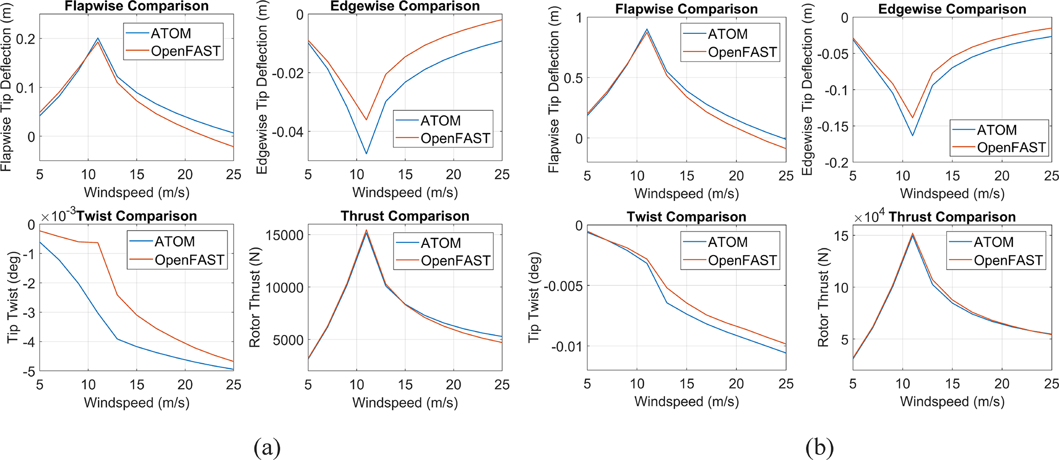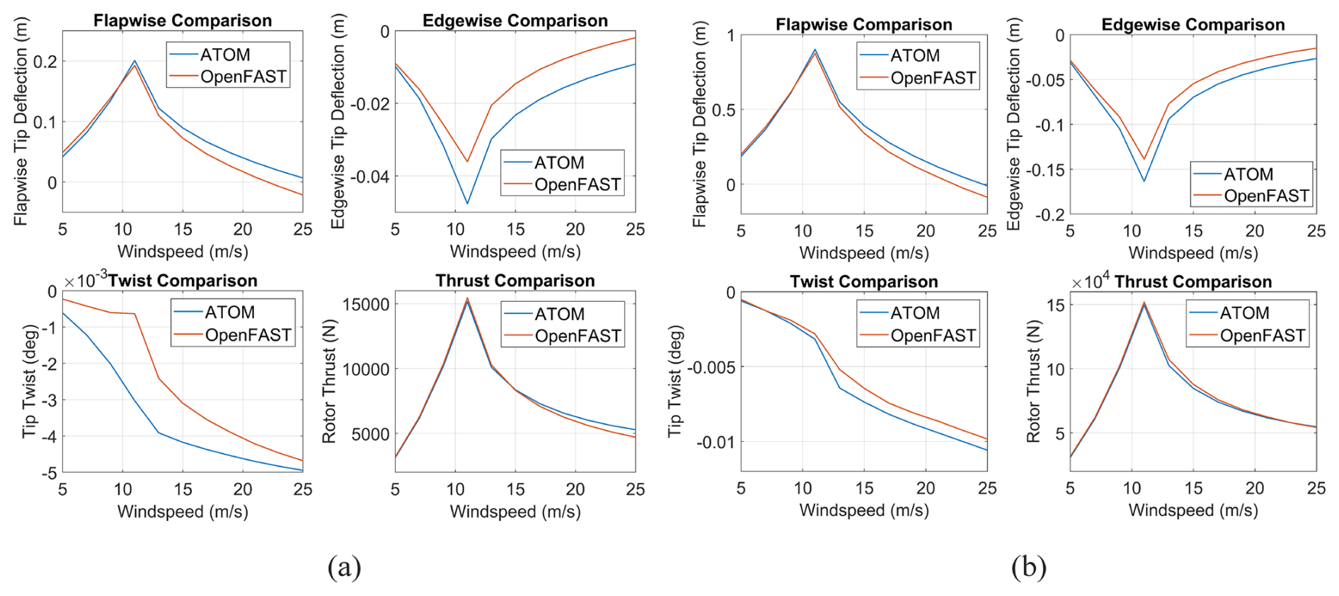 Figure 13Structural deformations at the blade tip for the (a) 100 kW and (b) 1 MW blade designs, compared between ATOM and OpenFAST. Rotor thrust is included to demonstrate the proximity in forces as opposed to the discrepancies in deflection, which suggests that the differing deflections are due to differences in the structural models.