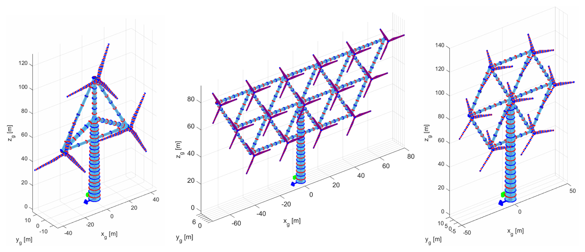 In order to better illustrate the use case of the rotor reference library, a selection of MRWT models is created. The overall system rated power is set to 3 MW, and the individual rotor capacities are determined based on the number of rotors. This results in two designs that use the reference rotors described in this study directly – a three-rotor model using three 1 MW rotors, and a 15-rotor model using fifteen 200 kW rotors. These are the only structurally feasible configurations that can be generated for a 3 MW multi-rotor system using rotors obtained solely from the reference library, and so this serves as an opportunity to demonstrate the flexibility afforded by the interpolation process. Using the rotor library as a reference, an additional model is created using seven interpolated rotors at a rating of 428.6 kW each. These demonstrative models are displayed in Fig. 15.