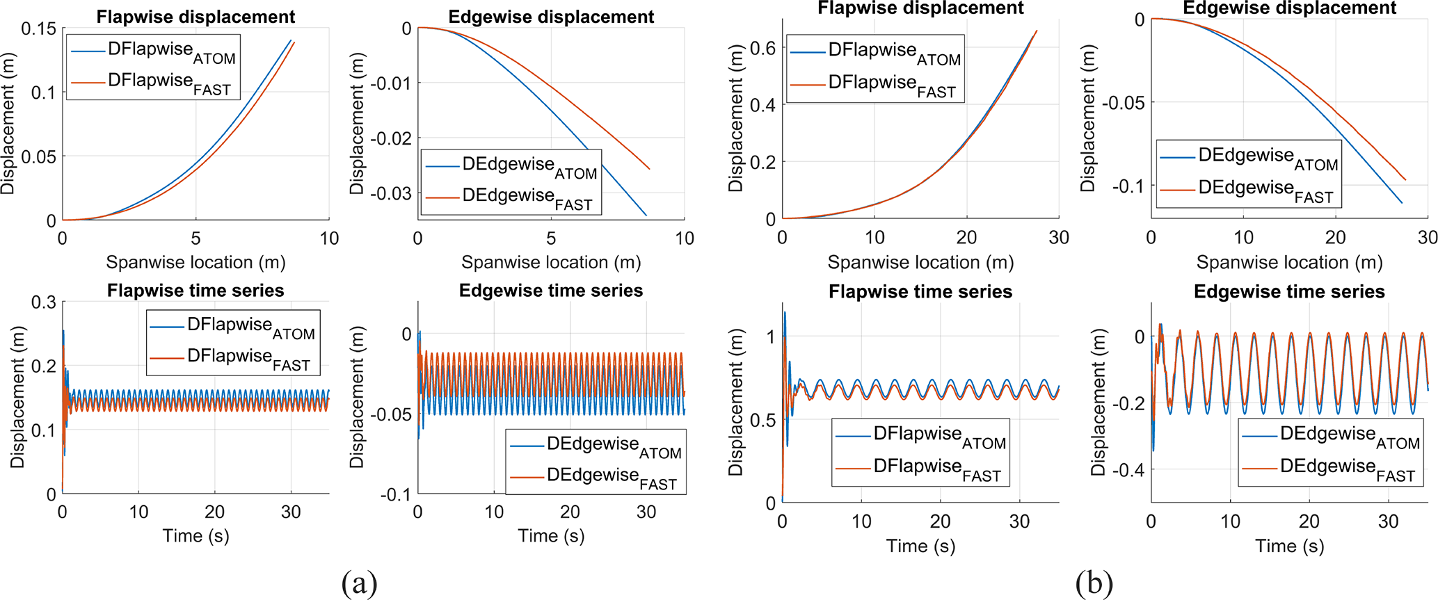 Figure A1Elastic response of the (a) 100 kW and (b) 1 MW blades in uniform 12 m s−1 wind, compared between ATOM and OpenFAST. In each case, the time-averaged displacements across the span as well as the time series for the tip displacements are compared.