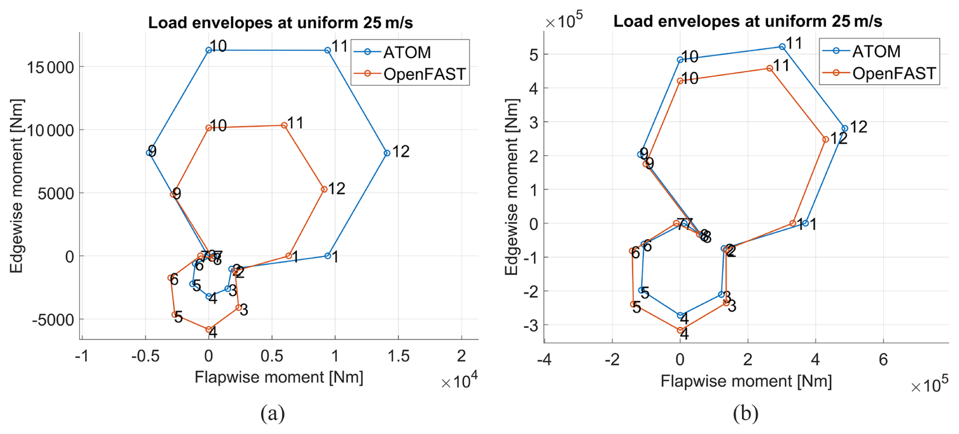 Figure A2Load envelopes calculated at the blade root for the (a) 100 kW and (b) 1 MW reference blades in 5 m s−1 (cut-in) uniform wind conditions. To remove transient effects, the first 3 s of the 30 s simulation are omitted.