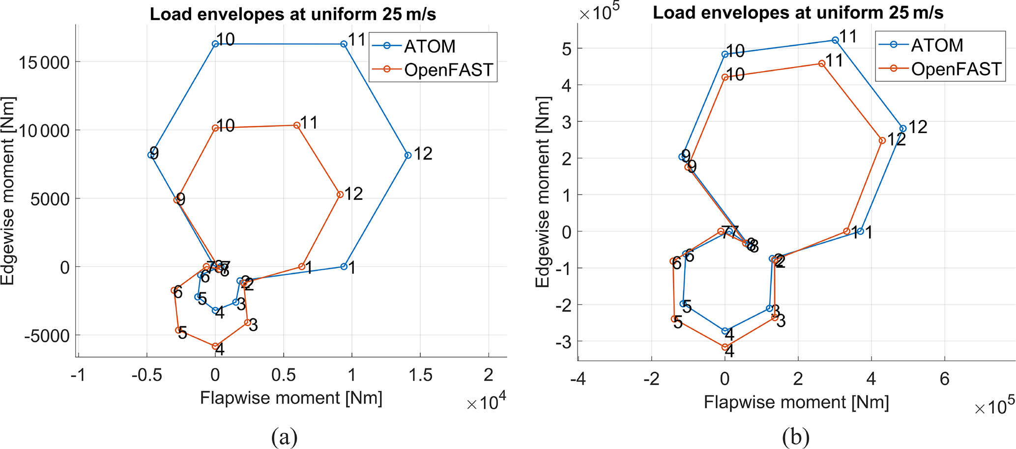 Figure A3Load envelopes calculated at the blade root for the (a) 100 kW and (b) 1 MW reference blades in 11 m s−1 (near-rated) uniform wind conditions. To remove transient effects, the first 3 s of the 30 s simulation are omitted.