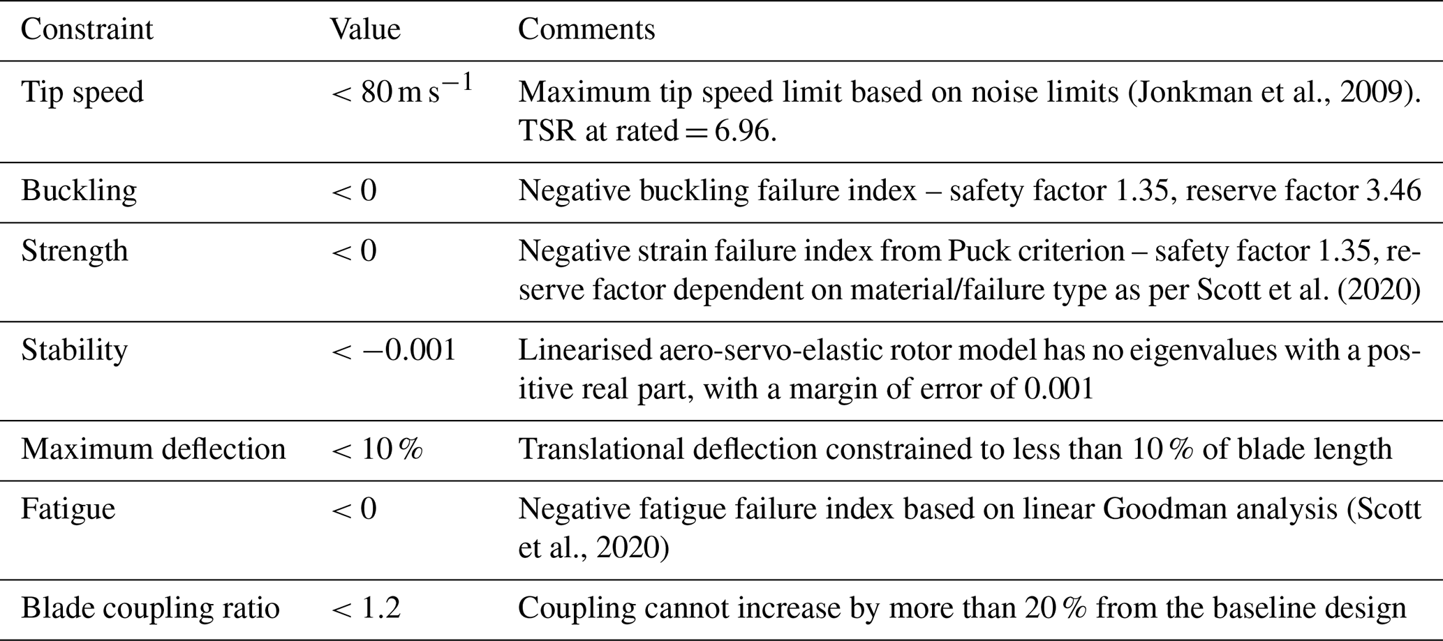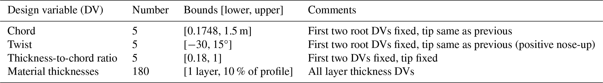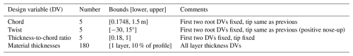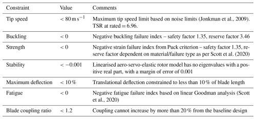 Constraints are enabled to ensure the structural, aeroelastic and manufacturing feasibility of the blades. Buckling failure indices are calculated according to analytical panel buckling (Lindenburg, 2005), while the failure strain is calculated as the lowest strain to produce any of the failure mechanisms modelled, including fibre compression, tension and inter-fibre failure. Fatigue indices are calculated using a linear Goodman analysis, with cycle data obtained using the rainflow cycle counting algorithm. The S–N curve slope for the glass fibre data used in the low-cycle fatigue region is 10. The failure index calculations used by ATOM are described in greater detail in Scott et al. (2020). Blade designs with a high degree of bend-twist coupling were found to cause discrepancies in the validation stage (Sect. 3.2) due to the differing structural models used in ATOM and the validation code (OpenFAST). For this reason, a constraint is set on the coupling of the blades, as defined by the ratio of dominant to non-dominant degrees of freedom in each eigenmode, so as not to increase from the baseline design by more than 20 %. In this case, the eigenmodes refer to the result of the modal decomposition performed on the linear finite element beam model of the blade (Macquart et al., 2020). Aside from ease of manufacture, the web straightening algorithm also serves the function of reducing coupling by placing the pitch axis of the blade along the thickest portion of each aerofoil. As this algorithm is not applied within the optimisation loop, the baseline “web-straightened” design is used as a benchmark for satisfactory coupling. Table 2 provides a summary of these constraints.