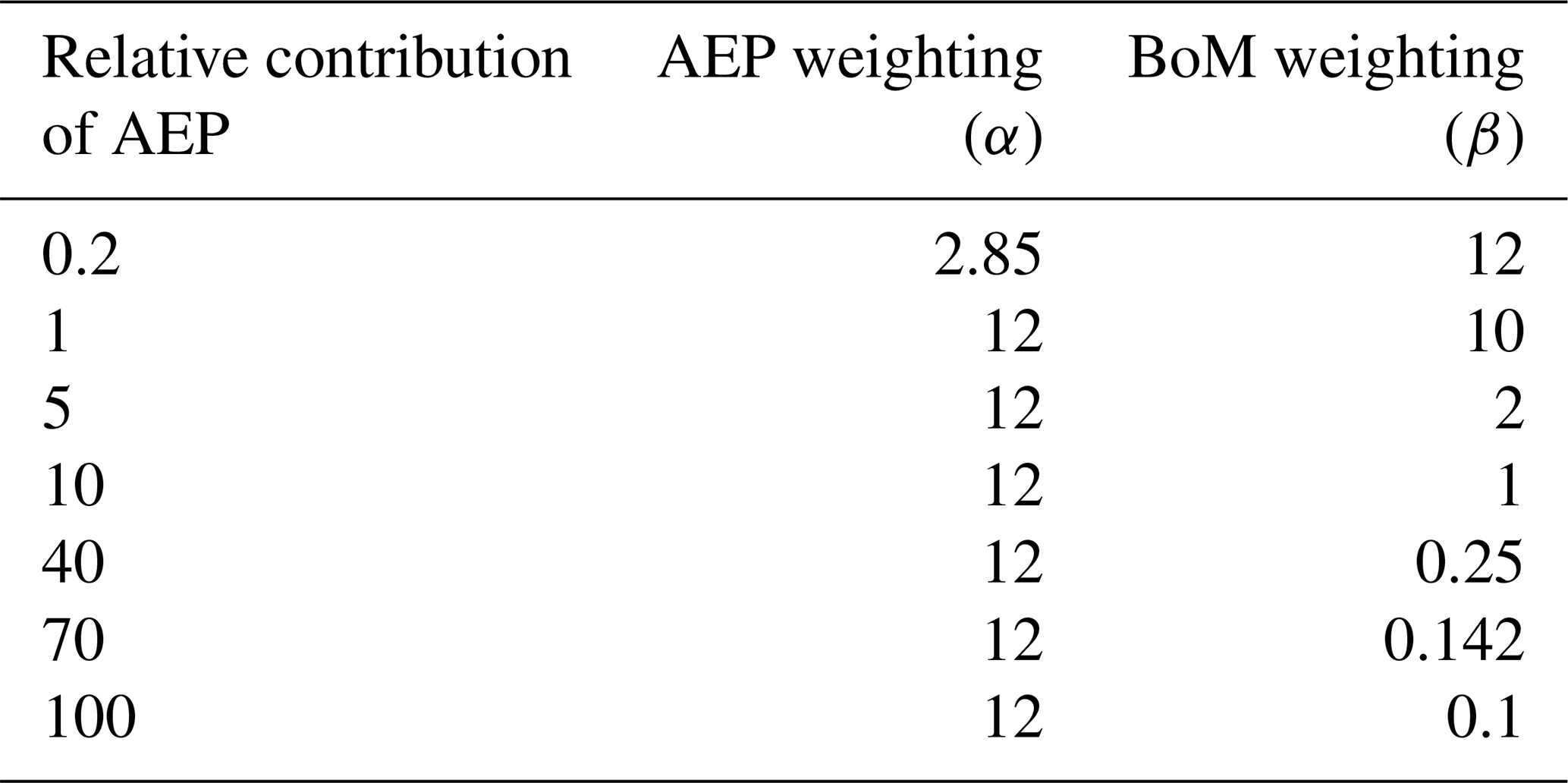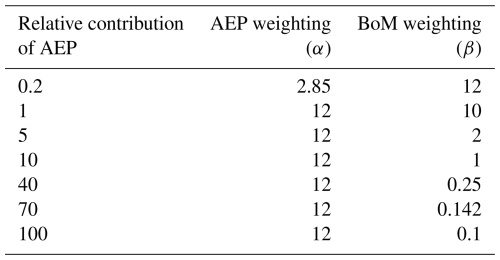 Table 3Weightings of AEP and BoM as implemented in Eq. (7) to give a range of relative contributions of AEP.