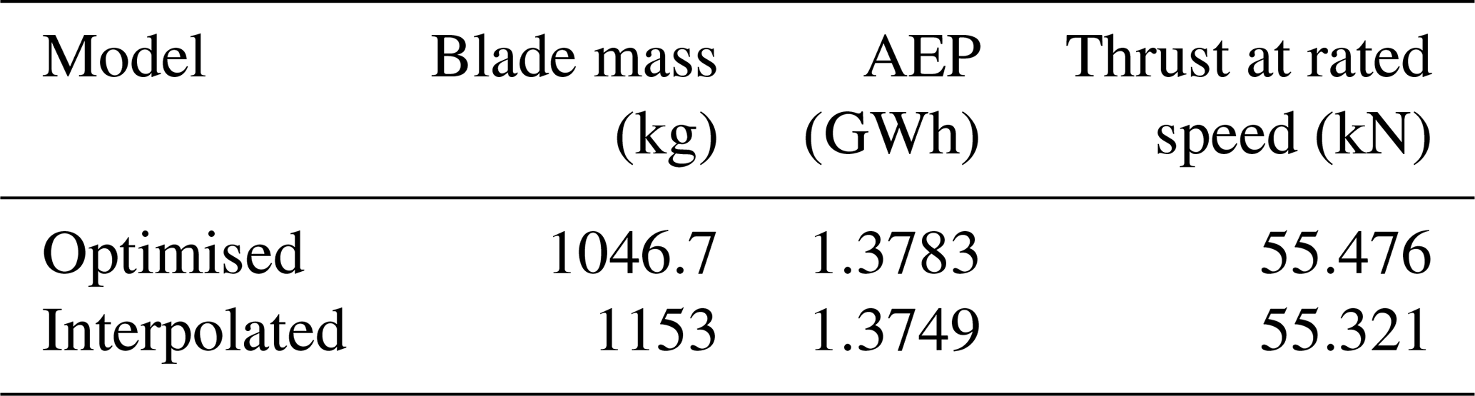 To validate the interpolated blade generation, a new blade design is generated at a rating of 375 kW using the interpolation process, and its performance is compared against the equivalent optimised blade from the design library. In this case, the optimised 375 kW design is removed from the library so the interpolation does not have access to it as a reference point. Table 4 compares the mass, AEP and thrust at rated speed between the interpolated and optimised designs, showing adequate similarity. These parameters are chosen as they are likely to be critical to the overall LCoE of the multi-rotor system through their impact on the support structure sizing and the power generation. Figure 14 demonstrates the similarity between the geometry of the interpolated blades, adding further confidence to the validity of the process in generating intermediate rotors for multi-rotor design studies.