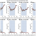 Aircraft data from this day are displayed in Fig. 6, showing the vertical profiles of wind speed (green) and potential temperature (black) of Flights 10 and 11 from 10 September 2023. The times of the vertical profiles range from 07:07 to 11:44 CDT, with sunrise at 07:12 CDT. The vertical profiles, as part of the flight trajectories, were conducted at Perry Municipal Airport and are therefore in the undisturbed flow and not affected by wind farm wakes.