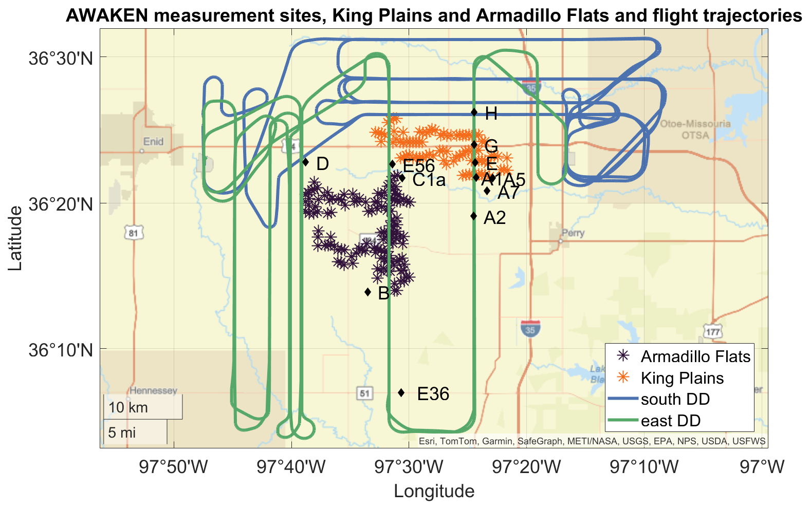 Figure 1Map of the Armadillo Flats (purple stars) and King Plains (orange stars) wind farms showing the flight trajectories of the research aircraft for Flight 20 for south (blue) and Flight 13 for east (green) wind directions (DD), along with the ground-based measurement sites (black diamonds).