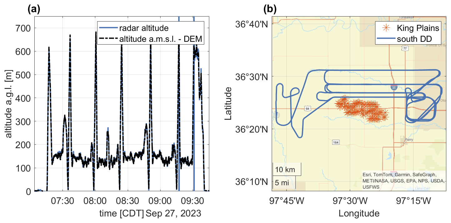 Figure 2Research flight on 27 September 2023 from 07:14 CDT to 09:42 CDT during southerly wind directions showing the altitude over time (a) and the trajectory on a geographical map including the King Plains wind farm (b).