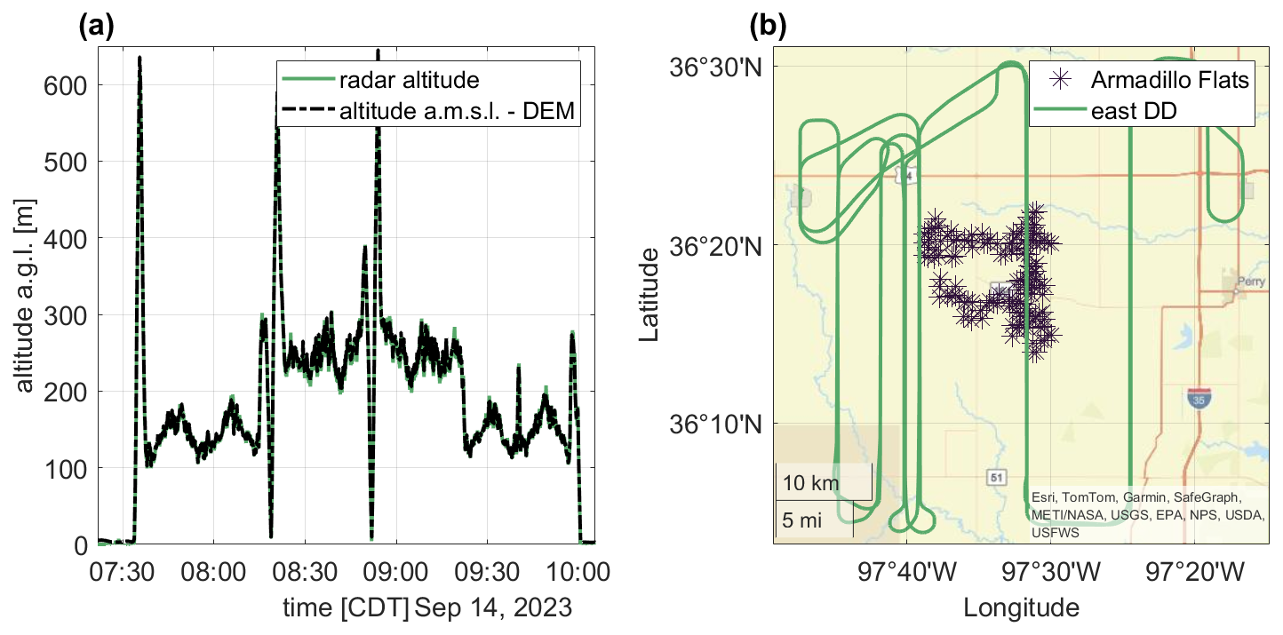 Figure 3Research flight on 14 September 2023 from 07:34 to 10:02 CDT during easterly wind directions, showing altitude over time (a) and the trajectory on a geographical map including the Armadillo Flats wind farm (b).