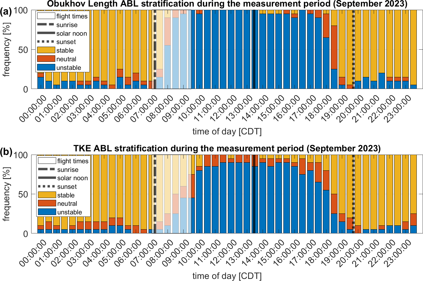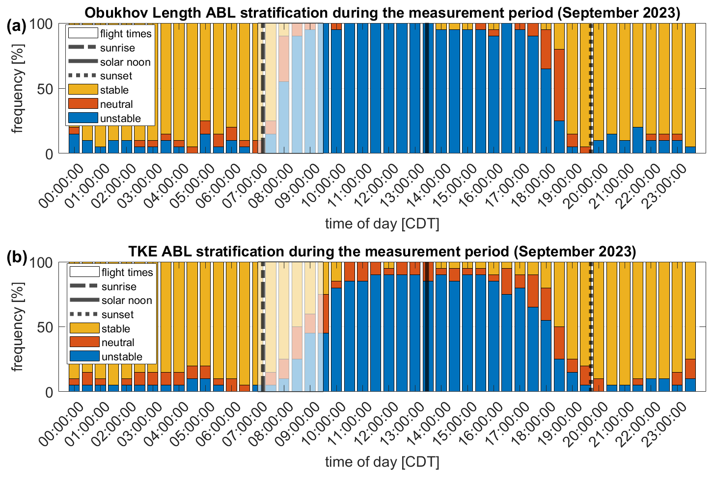 Figure 4The stratification classification according to Obukhov length (a) obtained by a ground-based sonic anemometer at Site A1 over time of day averaged over the aircraft measurement period (28 August to 29 September 2023) for stable (yellow), neutral (orange), and unstable (blue) ABL stratification, with the mean time of sunrise (dashed-dotted black line), solar noon (black line), and sunset (dotted black line). The approximate aircraft flight times are shown in a white transparent box. Panel (b) shows the stratification classification according to TKE obtained by a ground-based sonic anemometer at Site A1.