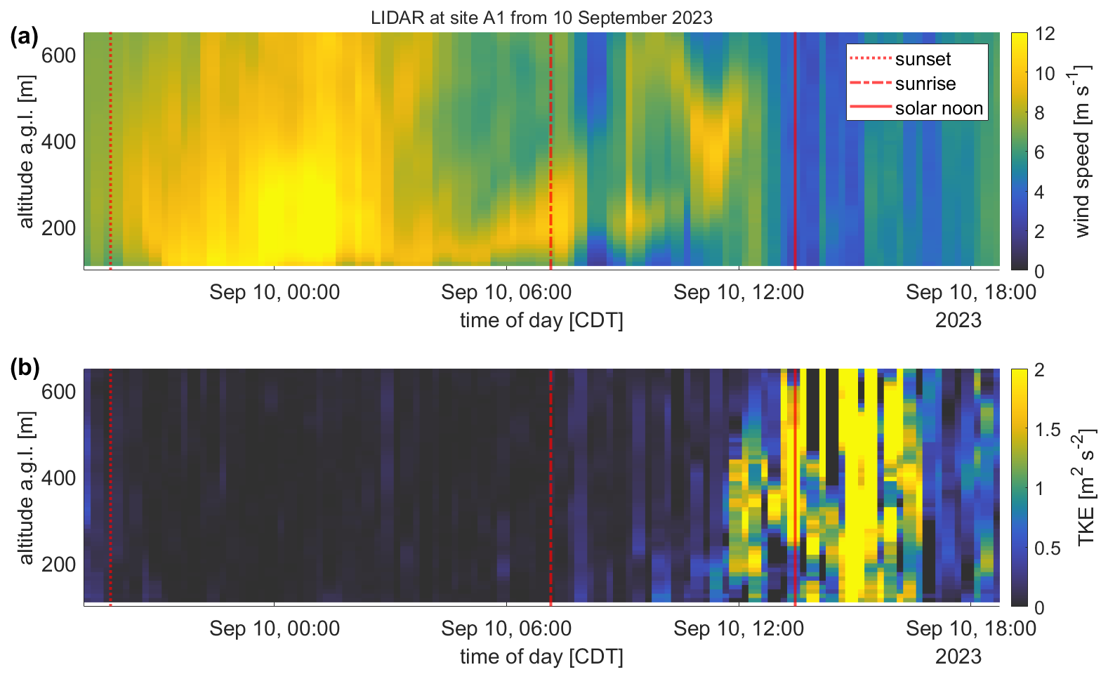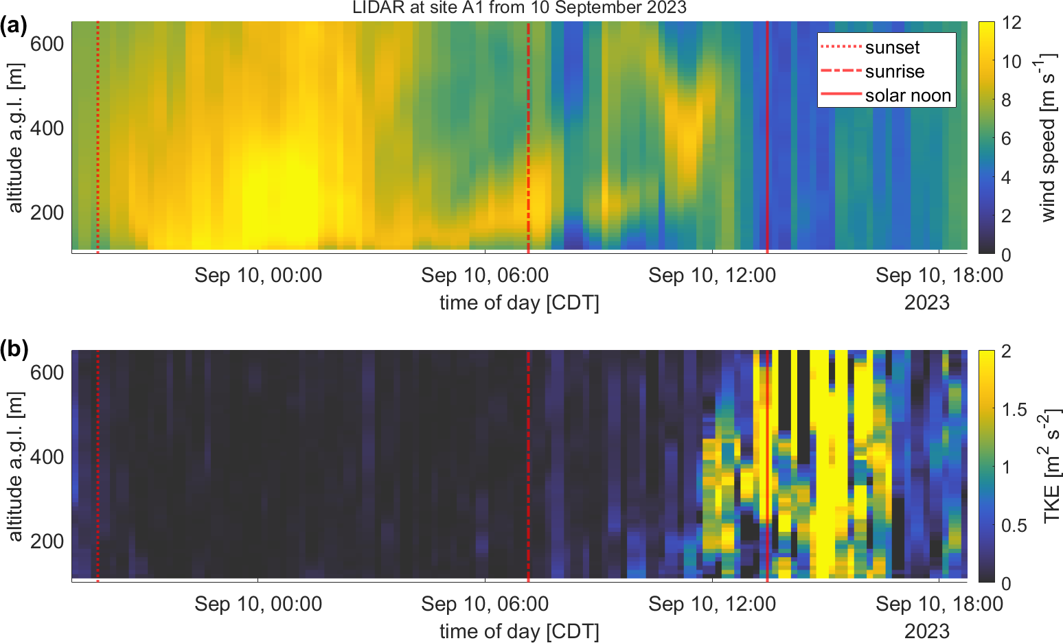 Figure 5Time series of wind speed (a) and TKE (b) over altitude a.g.l. from 9 September 2023 at 19:00 CDT to 10 September 2023 at 19:00 CDT based on lidar measurements at Site A1, upstream of the King Plains wind farm, with sunset (dotted red line), sunrise (dashed-dotted red line), and solar noon (red line) as an example of the diurnal cycle of the wind speed (a) and the TKE (b) in the SGP region during the aircraft measurement period. Lidar data are available from Bodini et al. (2025).