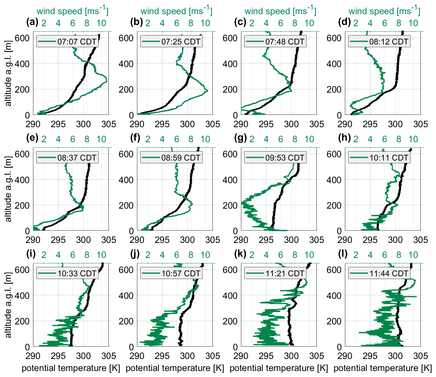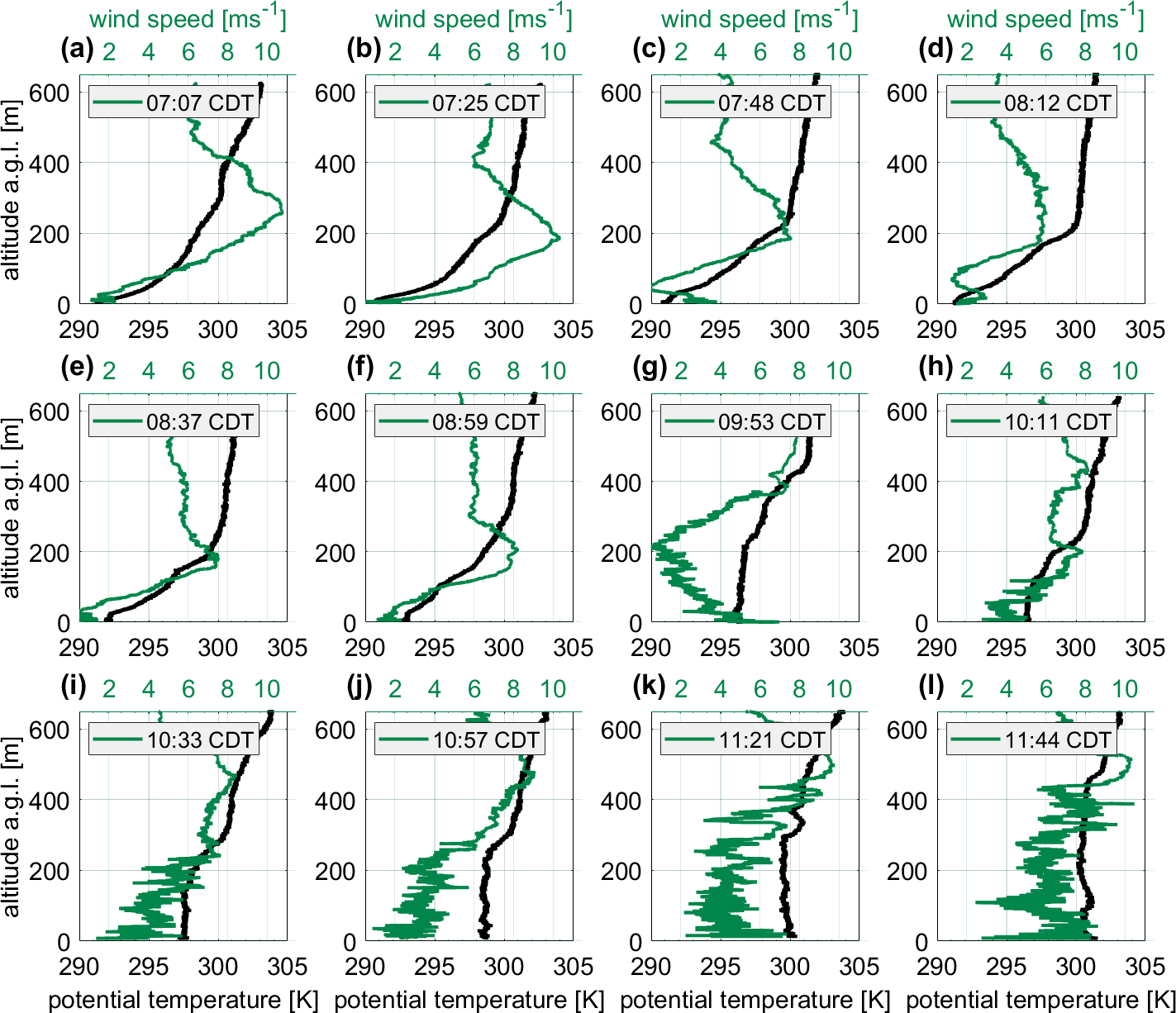 Characteristic of the stable stratification, a pronounced temperature inversion was observed in the morning between 07:07 and 08:59 CDT, indicated by an increasing potential temperature with height (Fig. 6a–f). From 09:53 CDT on, an unstable layer forms from the ground upward, characterized by a constant potential temperature with altitude and an increase in turbulence. During the course of the morning, the unstable layer continued to grow upward and the turbulence increased in altitude.