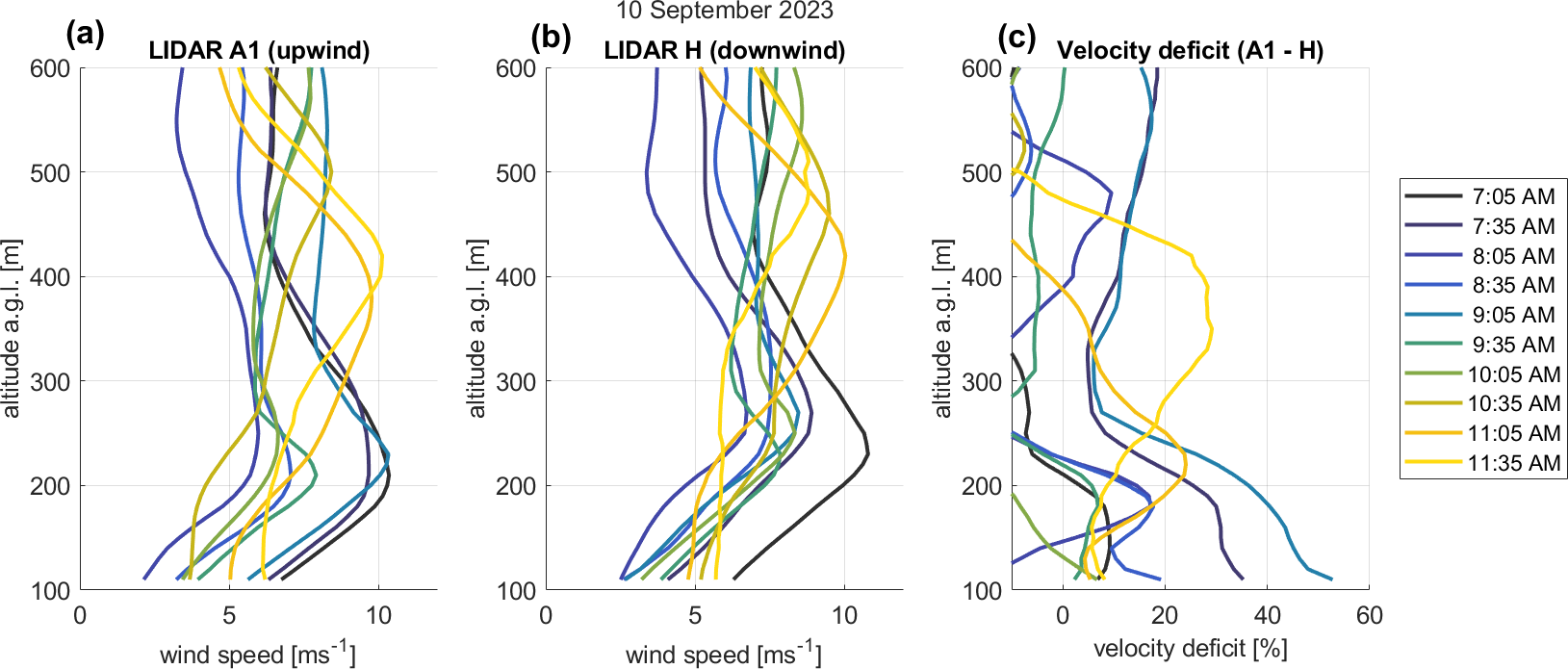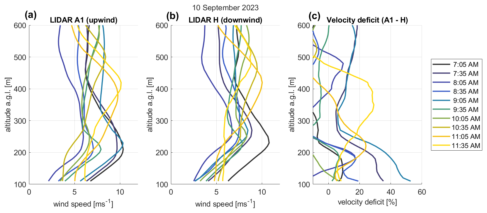Figure 7Vertical profiles of wind speed and the impact of wind farm wakes for Site A1 upstream of the wake area (a) and in the wake area (b), and the velocity deficit between the sites (c) on 10 September 2023 between 07:05 and 11:45 CDT (data available through Letizia and Bodini (2024); Bodini et al. (2025), last access: 5 November 2024).