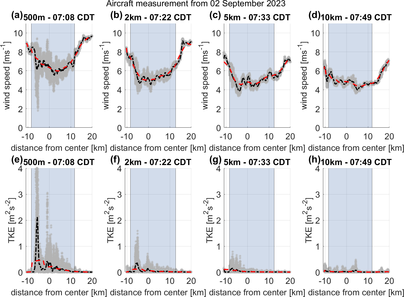 Figure 8Illustration of wind speed and TKE (gray dots), median average over 0.78 km (dashed-dotted black line), and median average over 6.07 km (dashed red line) for first four legs of Flight 4 with respect to the distance from the center of the King Plains wind farm (blue-shaded area).