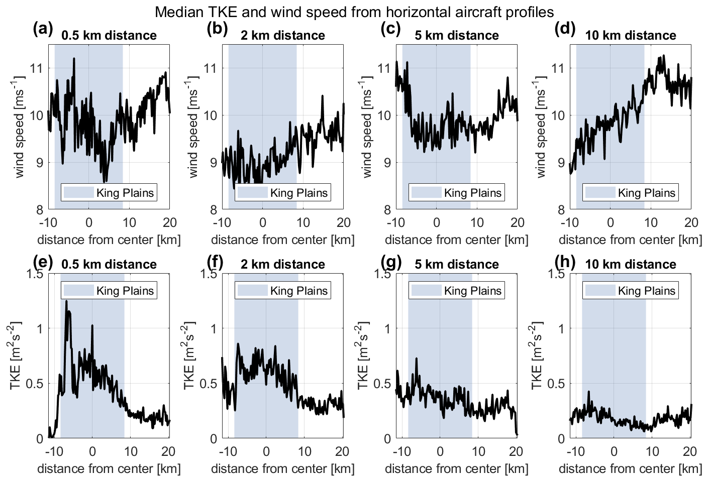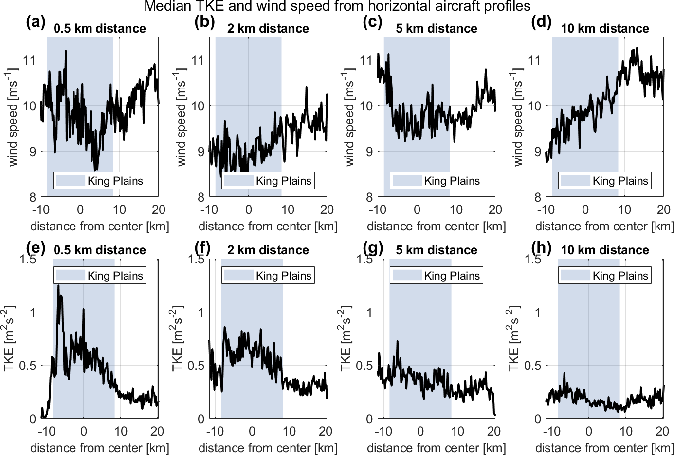 Figure 9Illustration of median wind speed (a–d) and median TKE (e–h) from all wake measurement flights over a horizontal distance of 200 m from the center of the King Plains wind farm (shaded-blue area) with different distances downwind of the King Plains wind farm (0.5, 2, 5, and 10 km).