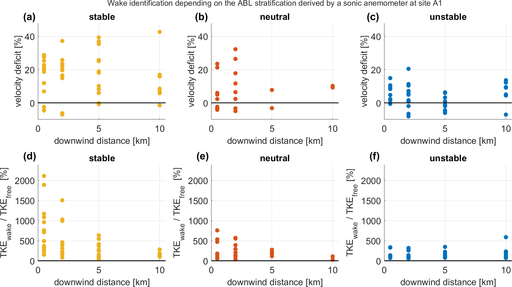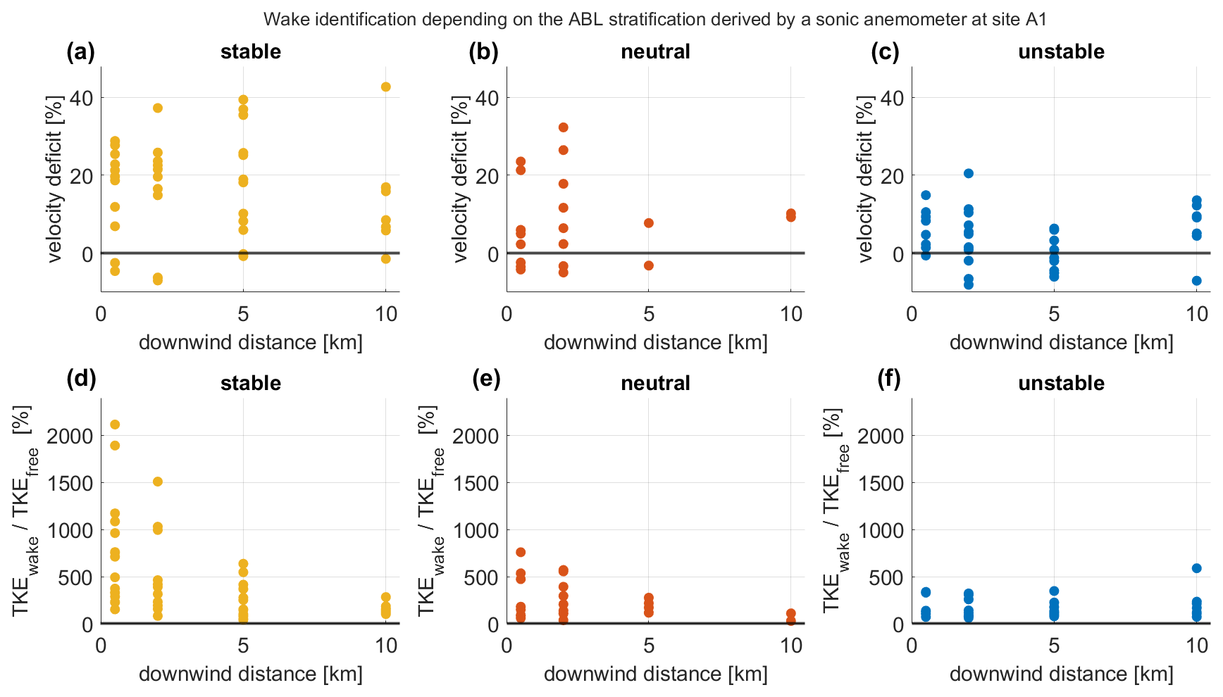 Figure 10The velocity deficit of the wind speed in the wake compared to the wind speed in the free flow from aircraft measurements for stable (a), neutral (b), and unstable (c) conditions derived from the TKE of the sonic anemometer at Site A1. The median TKE in the wake compared to the median TKE in the free flow (d–f) downwind of the King Plains wind farm.