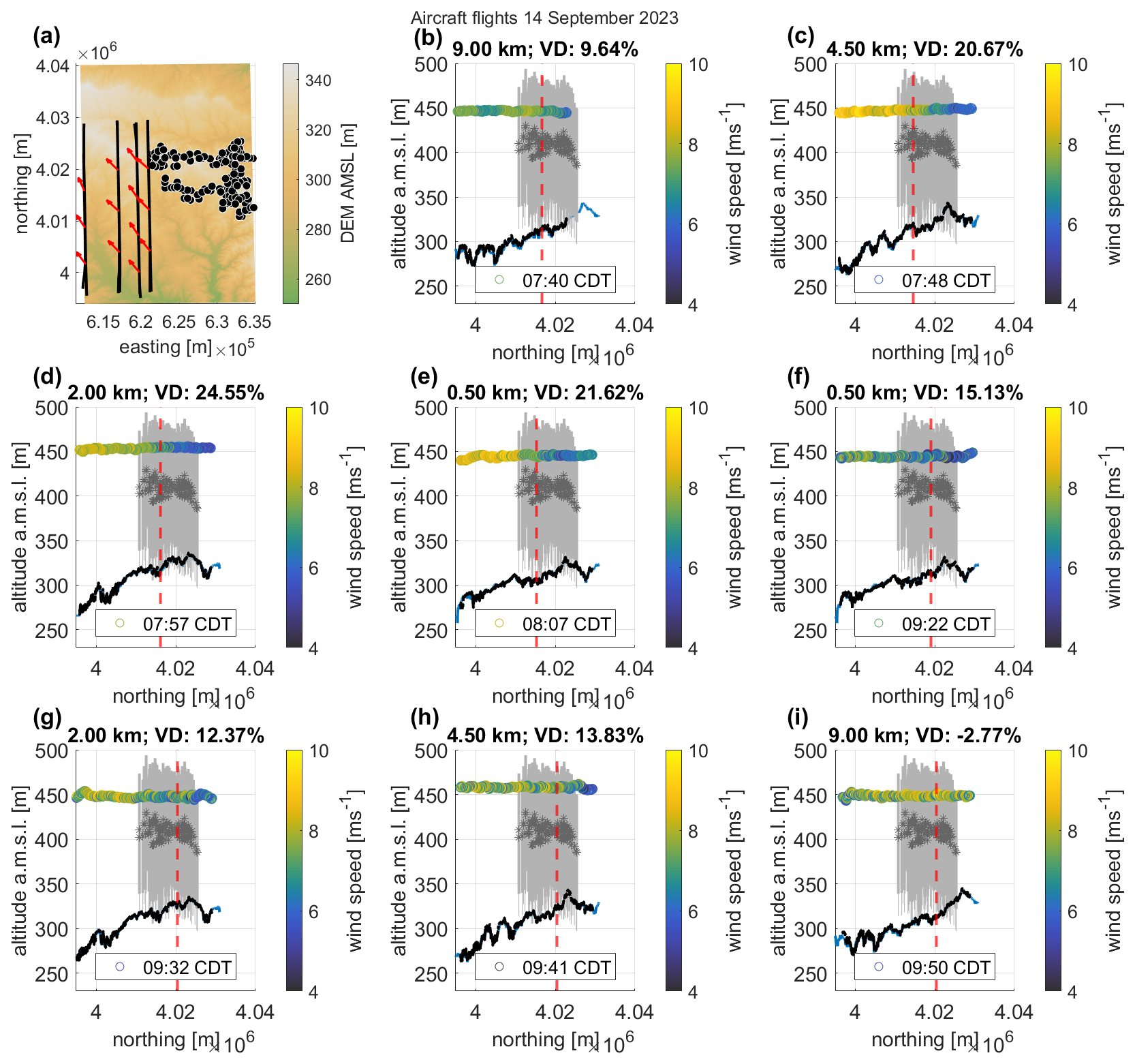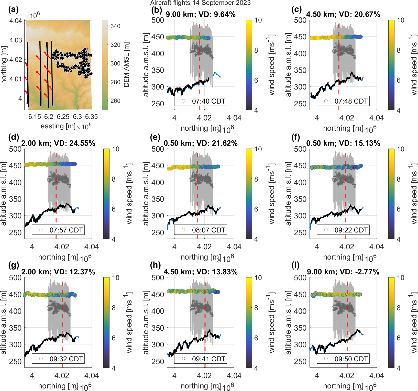 Figure 12Wake investigation for southerly wind direction. (a) Overview of the legs (parallel black lines), the King Plains wind farm (black/white dots), and the wind direction across the legs (red arrows); (b–i) the wind turbines of the King Plains wind farm (gray lines), the hub heights (gray stars), the topography obtained from the digital elevation model (blue line, U.S. Geological Survey (2018)), and the cut-off line (dashed red line) between the wake and the undisturbed area to calculate the velocity deficit (VD), derived from lidar data at Site A1 for the time of the leg at 110 m a.g.l. The wind speed is color coded.