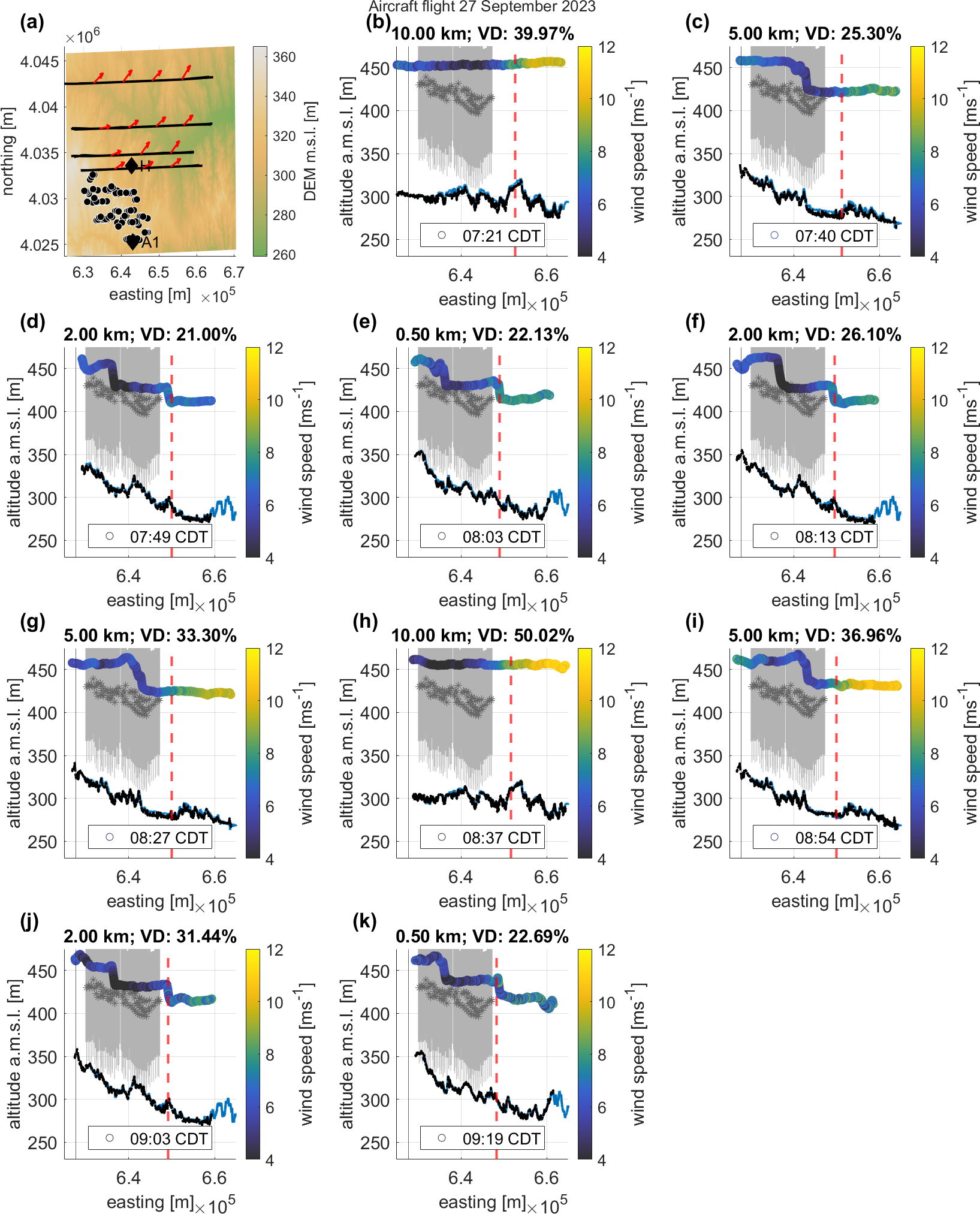 Figure 11Wake analysis for easterly wind direction. (a) Overview of the legs (parallel black lines), the Armadillo Flats wind farm (black/white dots), and the wind direction across the legs (red arrows). (b–i) The wind turbines of the Armadillo Flats wind farm (gray lines), the hub heights (gray stars), the topography obtained from the digital elevation model (blue line, U.S. Geological Survey2018), and the cut-off line (dashed red line) between the wake and the undisturbed area to calculate the velocity deficit (VD), derived from lidar data at Site A1 for the time of the leg at 110 m a.g.l. The wind speed is color coded.