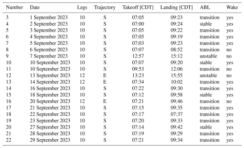 The trajectories were planned depending on the prevailing wind direction (Fig. 1). As described in Krishnamurthy et al. (2021), the predominant wind direction in this season is south. During the campaign, 17 flights were flown with a predominant southerly wind direction, and three flights were flown with a predominant easterly wind direction. The flights were mostly conducted in the early morning from sunrise at around 07:00 CDT (central daylight time is the local time, corresponding to 12:00 UTC) to 09:30 CDT (14:30 UTC). On most days during the measurement period, due to a strong diurnal cycle of the ABL, a convective boundary layer with strong turbulence formed shortly after sunrise, resulting in an increase in turbulence and a change in stratification from stable to unstable.