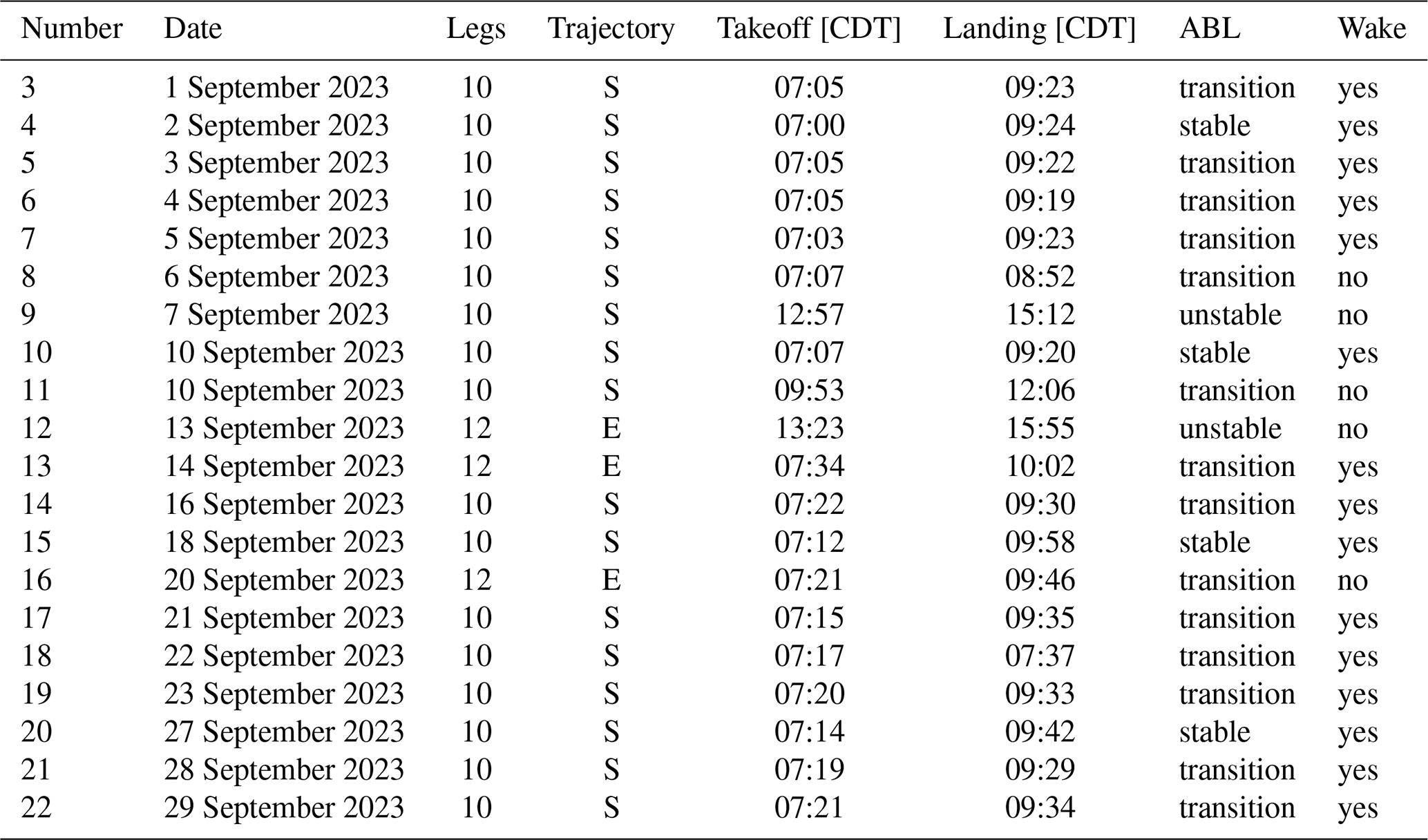 Table 1Overview of the flights during the AWAKEN project in Oklahoma by the D-ILAB aircraft, with the number of horizontal legs performed during the flight, southerly (S) or easterly (E) trajectory, flight times, stratification of the ABL (where the transition represents the times when the ABL was stably stratified during the first legs and unstably stratified during the later legs), and whether there were conditions for a wake from either the King Plains or Armadillo Flats wind farms. Flight numbers 1 and 2 were preparation flights and are not included in the analysis.