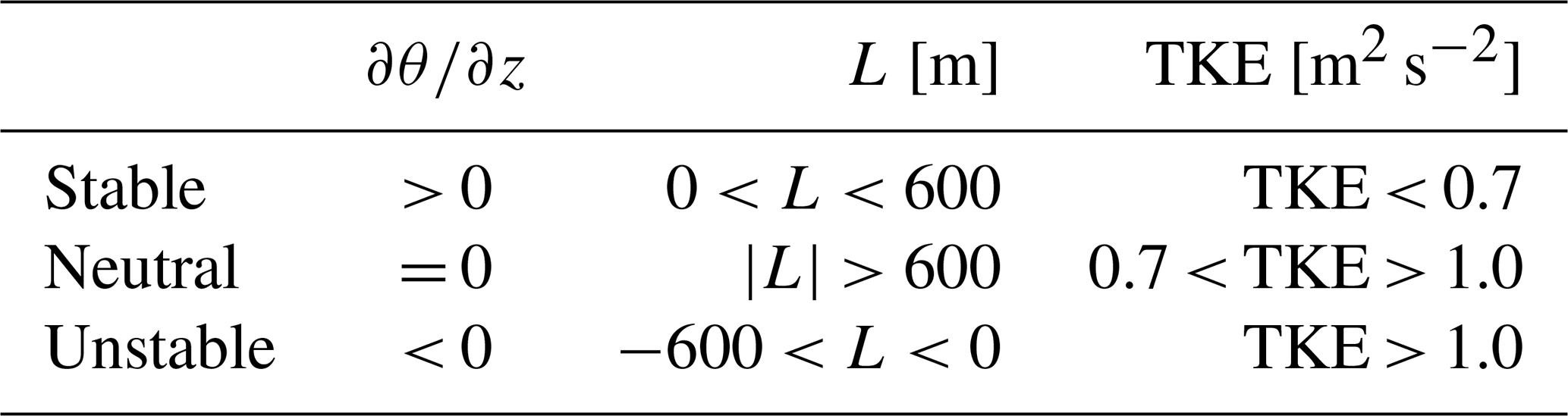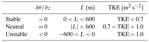 Table 2Overview of ABL stratification classification measure thresholds for potential temperature gradient θ/z, Obukhov length L, and TKE from Wharton and Lundquist (2012).