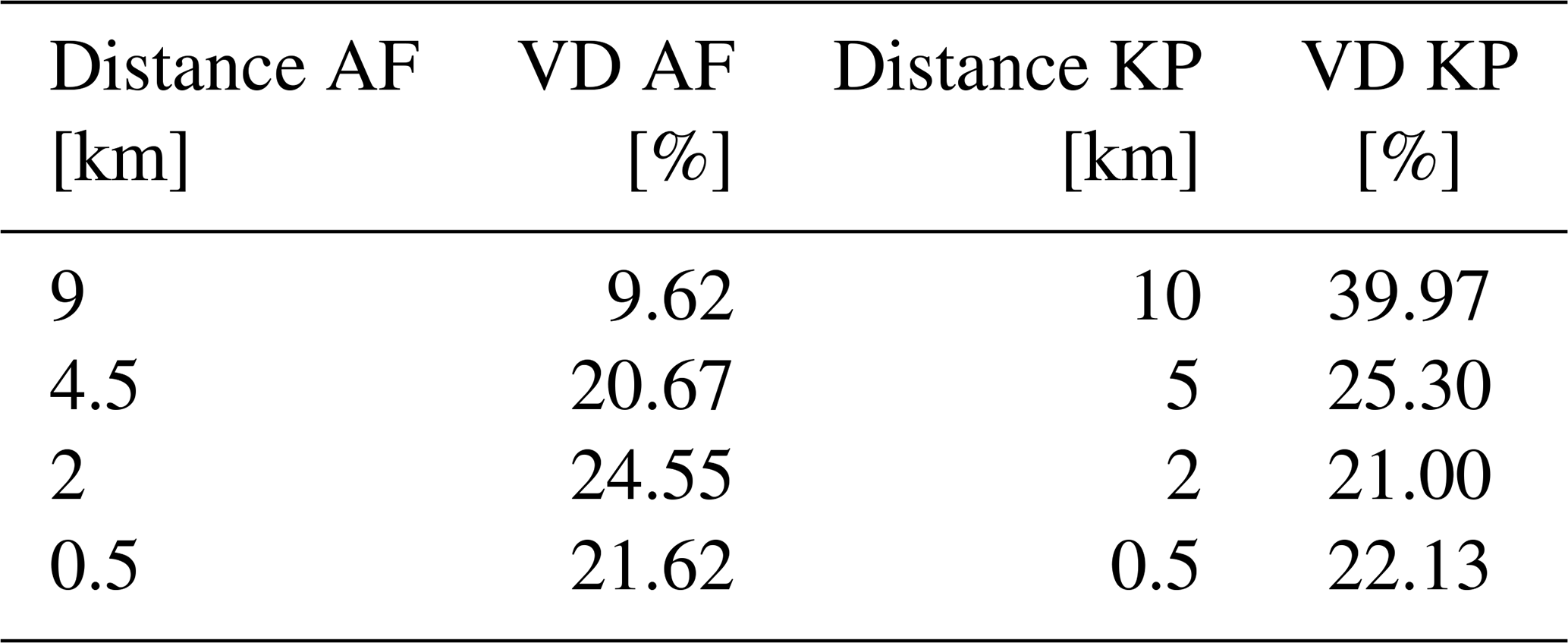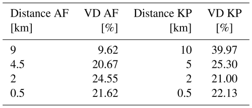 Table 3Overview of the velocity deficit (VD) values and the corresponding distances from the Armadillo Flats (AF, homogeneous terrain) and King Plains (KP, semi-complex terrain) wind farms.