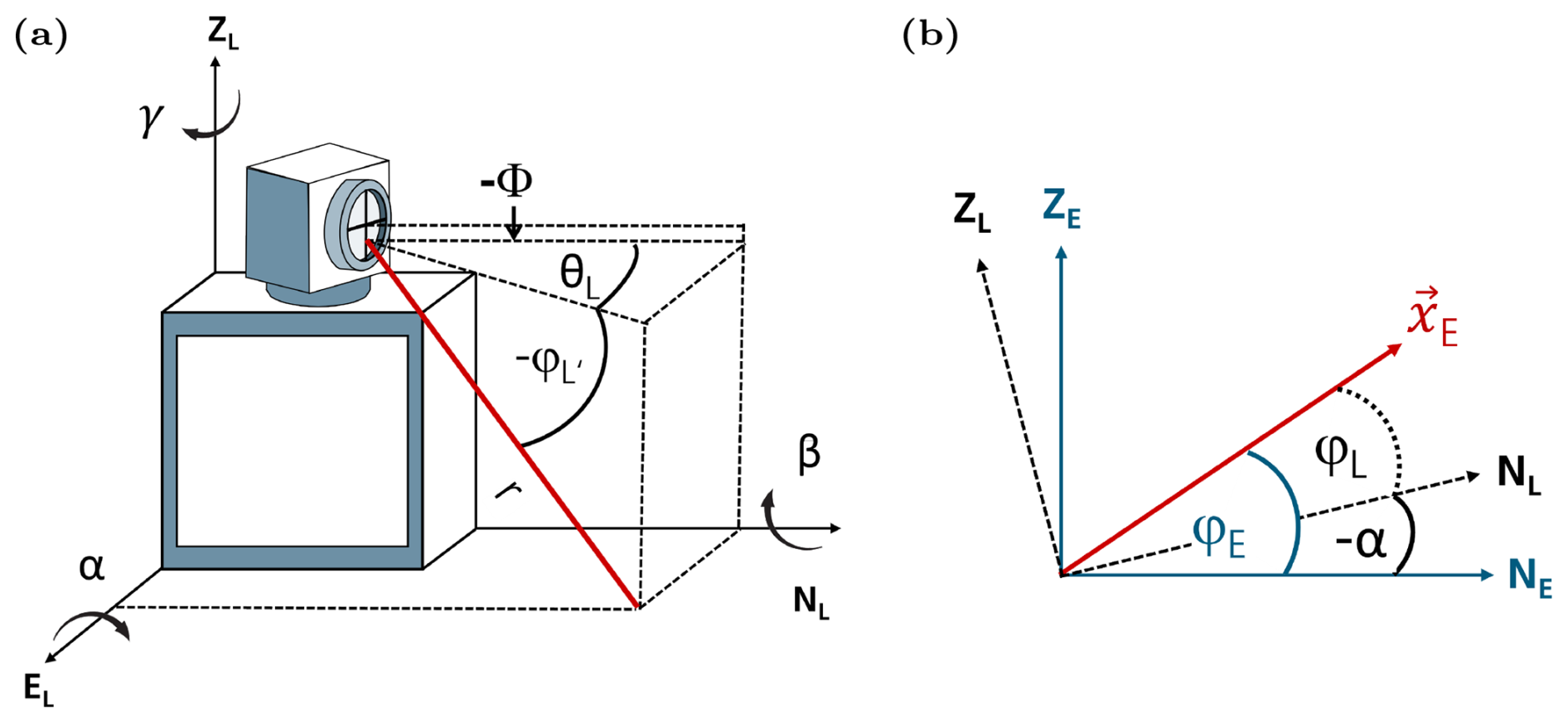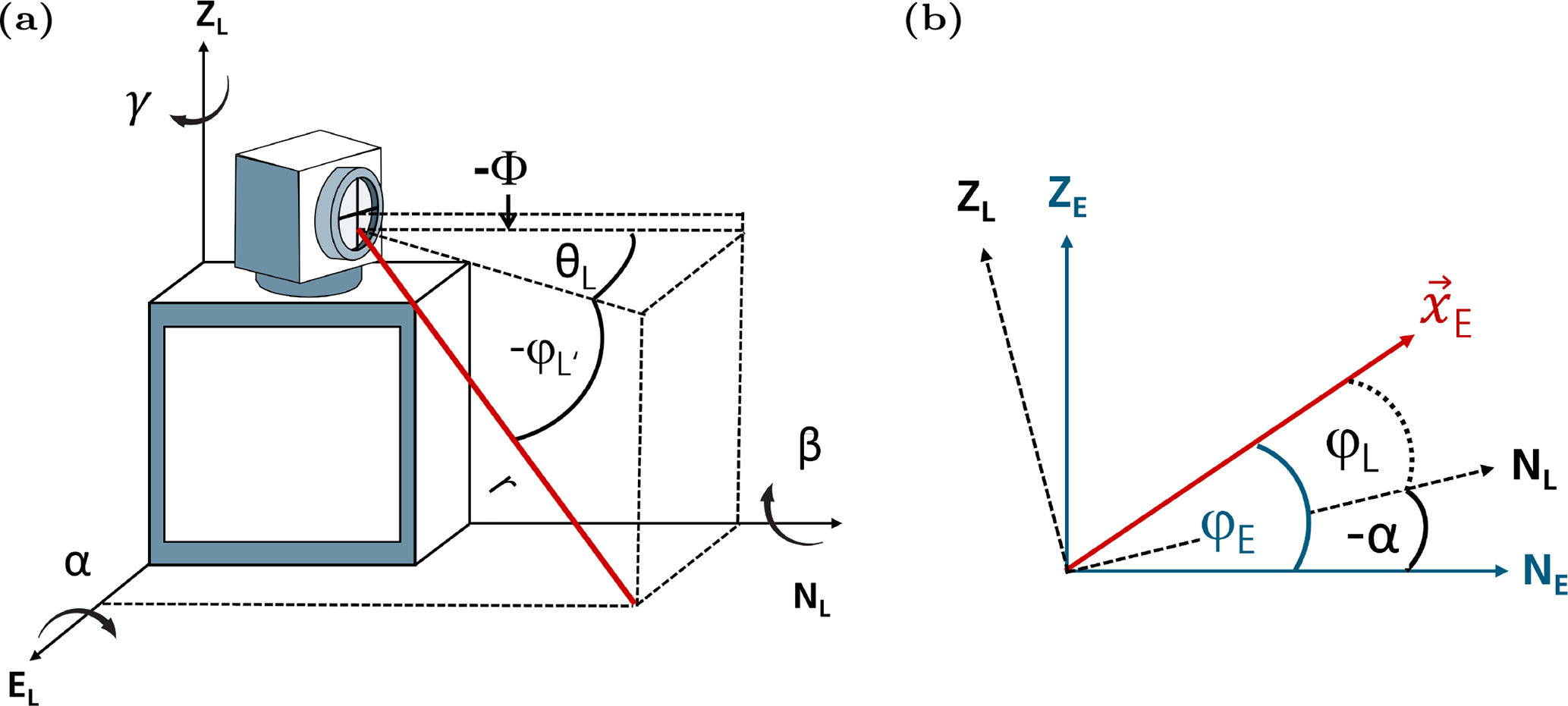 Figure 1(a) Illustration of a scanning lidar's orientation parameters. The laser beam (red) is defined by range r, elevation , and azimuth θL in the lidar's internal coordinate system (NL: device north, EL: device east, ZL: device vertical axis). Device tilt is given by the pitch α (positive for downward tilt to the north), roll β (positive for downward tilt to the west), and yaw γ (positive clockwise). In addition, a negative elevation offset Φ is shown, shifting the laser beam downward. (b) A 2D schematic of the transformation from the internal lidar (L) to the external orthogonal (E) coordinate system about −α. The external direction vector xE (red) results from the lidar elevation φL combined with the pitch tilt.