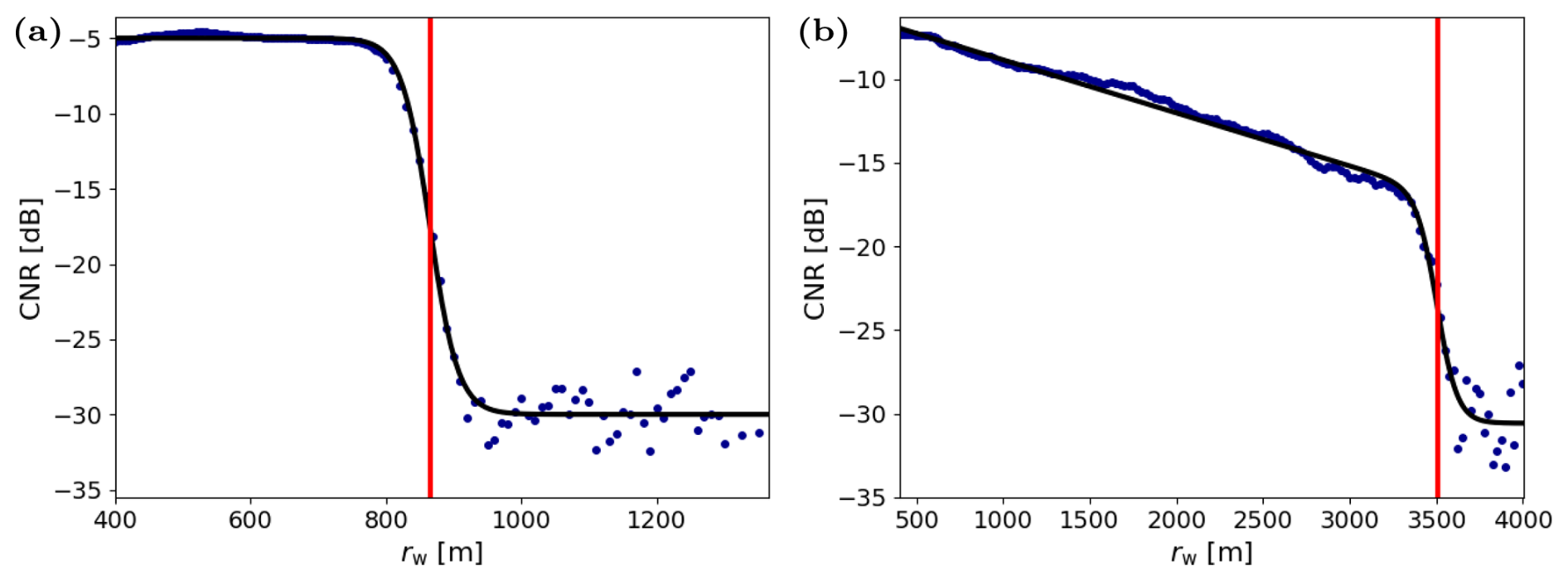 The SSL method requires an accurate estimation of the range rw between the laser emission point of a scanning lidar and the water surface at a fixed elevation and azimuth angle. For SSL, rw is derived from the evolution of CNR over the range. If the laser beam of a lidar hits a solid object, in general, a very strong back-scatter signal is obtained. However, in contrast, when the beam hits the sea surface, the signal usually exhibits a sharp decrease in CNR values around this distance (Rott et al., 2022). This behaviour, seen in Fig. 3, can be attributed to the ability of the water surface to absorb parts of the laser light and/or reflect it in directions other than back to the lidar device.