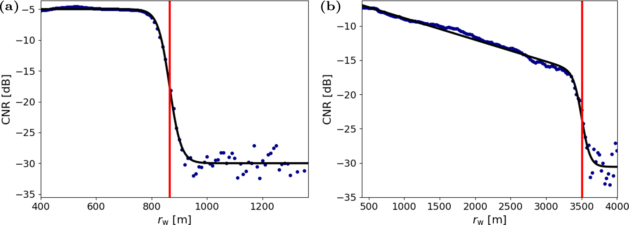 where χ(s) is the weighting function of the signal along the beam. The exact modelling of the CNR drop-off with increasing r requires detailed knowledge of χ(s). While several studies have used models to describe the weighting inside the probe volume to, for example, model turbulence attenuation (Mann et al., 2009; Pauscher et al., 2016; Peña and Mann, 2019), the exact shape of χ(s) remains uncertain and depends on both pulse shape and signal processing and therefore also on the device type (e.g. Pauscher et al., 2016). Detailed information about these aspects was not available to the authors. Moreover, at the inflection point, as well for the majority of the steep CNR drop-off, the signal is several orders of magnitude smaller than the signal before the probe volume enters the water (see Fig. 3). This makes modelling of the CNR drop-off extremely sensitive to assumptions about the tail end of χ(s) – an area where models of χ(s) are likely to be very uncertain.