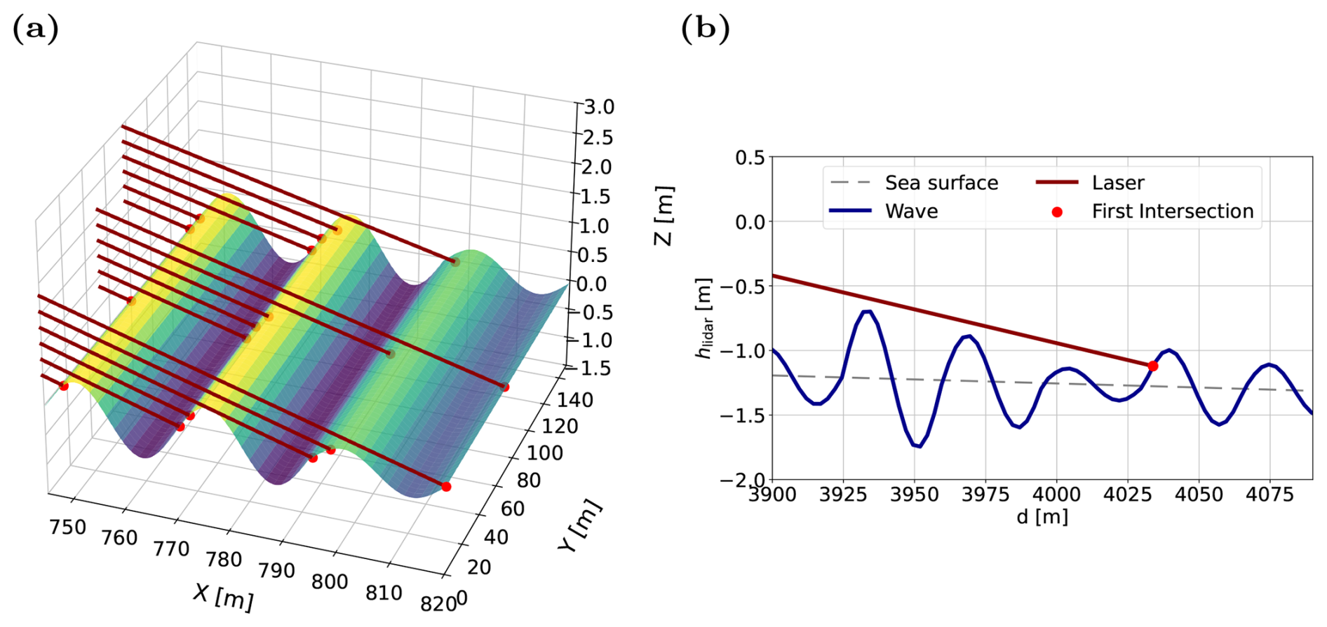 The amplitude distribution remains constant across the entire domain, while the wave shifts over time via the phase parameter x0. This generates realistic, non-stationary waves with different amplitudes, which are shifted in relation to the position of the lidar. Figure 4a and b show examples of the simulated wave model for selected elevation and azimuth angles and a specific significant wave height. The first intersection point between the laser beam and the wave is determined (red points), and the distance is calculated. A wave movement is simulated by changing x0, accounting for the time required by the lidar to change between beam directions.